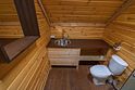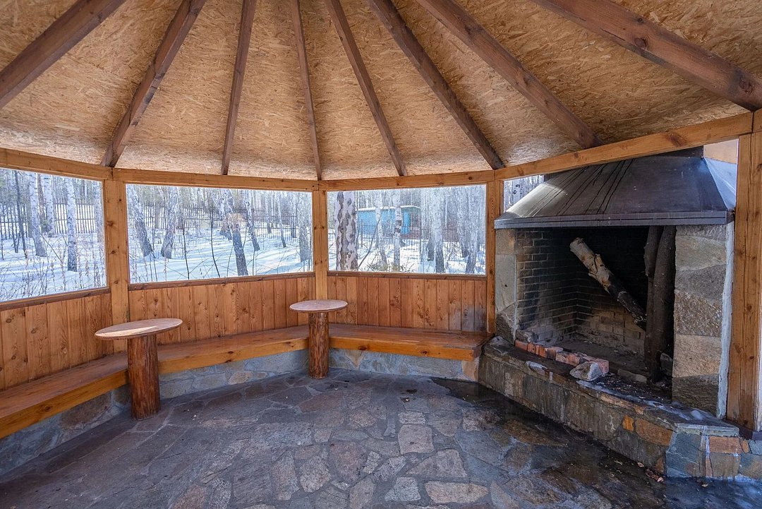 Кухонная зона (холодильник, двухкомфорочная электроплита, набор кухонной и столовой посуды); санузел (унитаз, умывальник, душ); мангальная зона со столом и лавками.