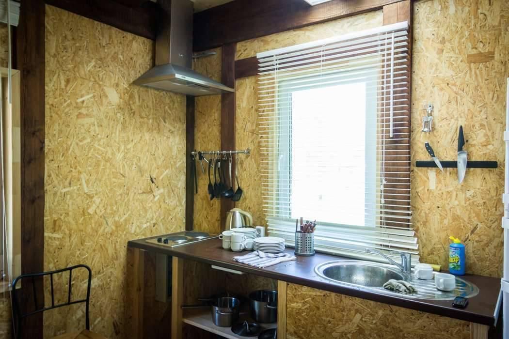 - общая гостинная с кухонной зоной (холодильник, двухкомфорочная плита, набор кухонной и столовой посуды)