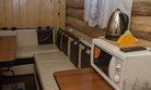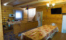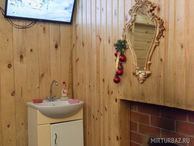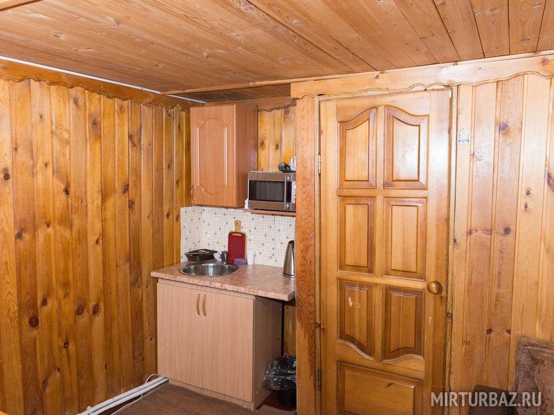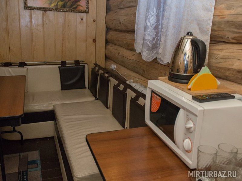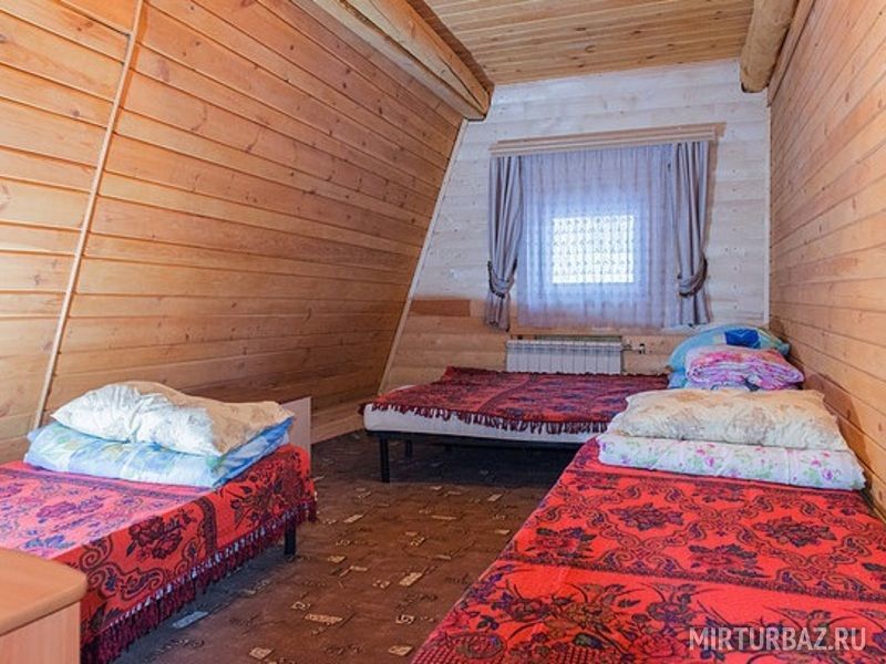 Дом в русском стиле подойдет для большой компании. На втором этаже 2 спальни по 4 односпальные кровати в каждой. В прихожей 2-спальный диван. На первом этаже — кухонная зона, сан/узел, сауна, 2-спальный диван, большой богатырский стол и лавки. Придомовая территория огорожена на ней находится мангальная зона и парковка на 3 машиноместа.