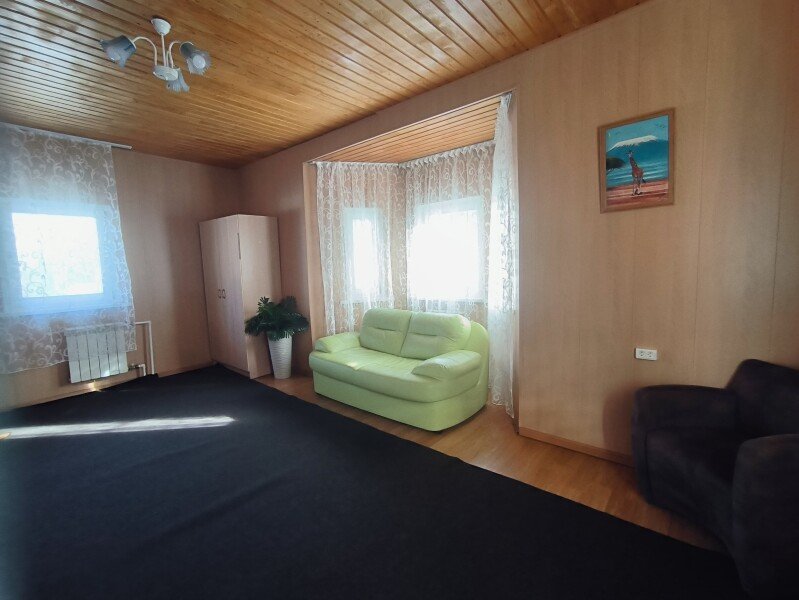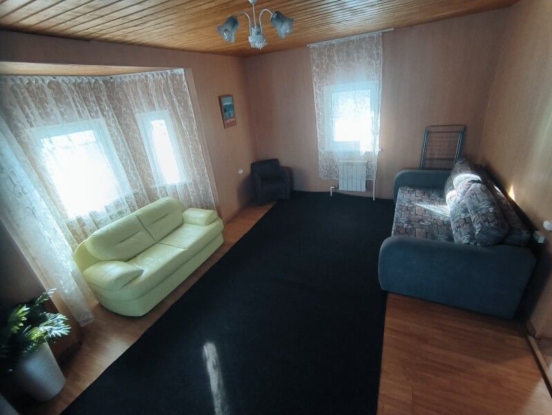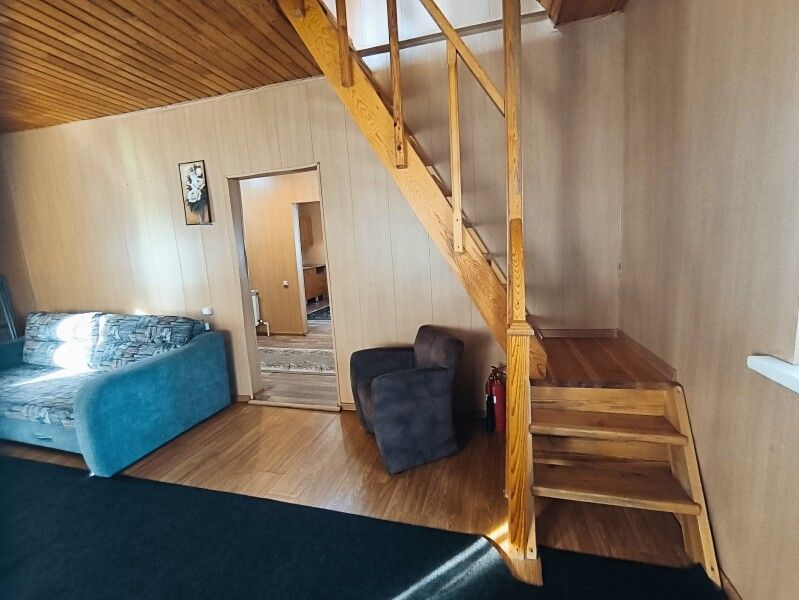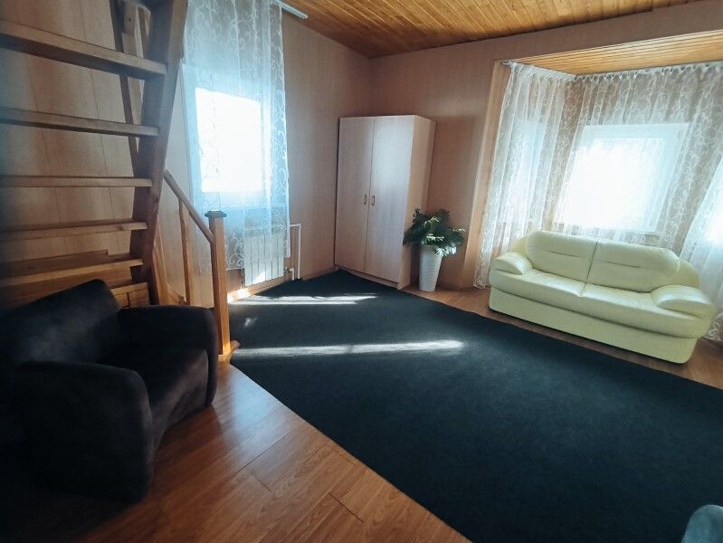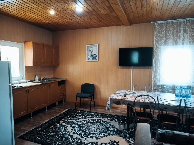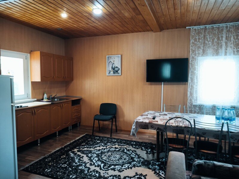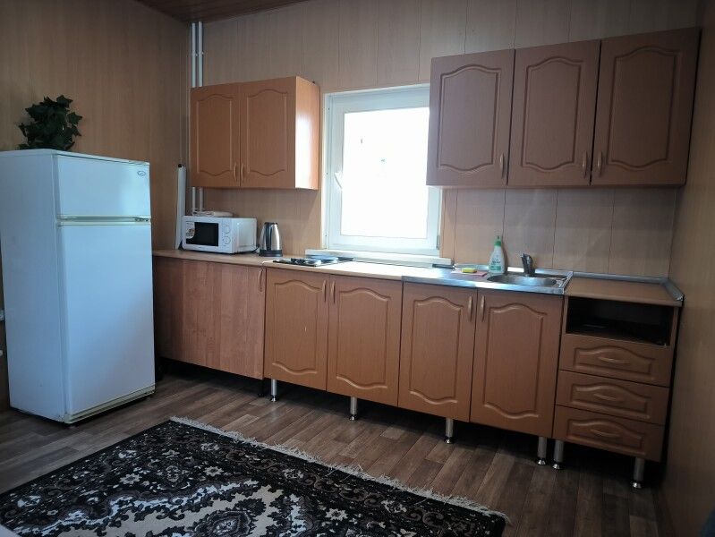 Первый этаж полностью укомплектованная кухня холодильник, двух конфорочная плита, электрический чайник, микроволновая печь, стол, стулья диван раскладной.