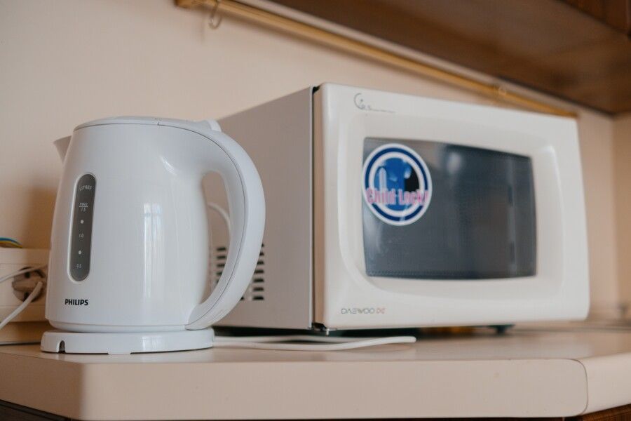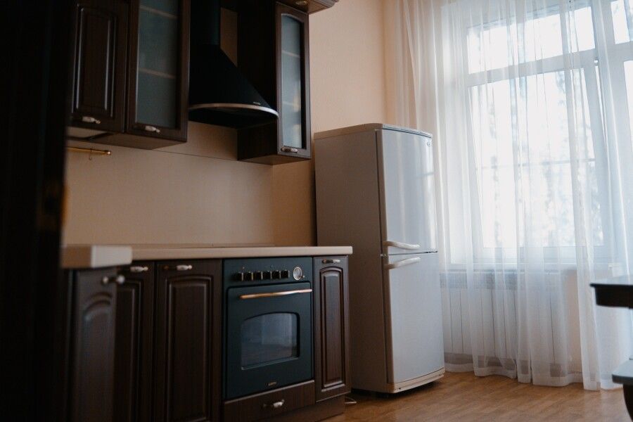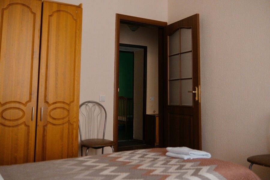 Номера находятся в цокольном этаже с общей укомплектованной кухней. В кухне плита, духовой шкаф, стол, стулья, два холодильника, термопот, электрический чайник, микроволновая печь.