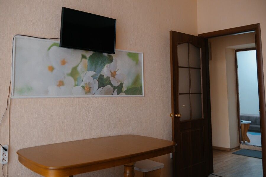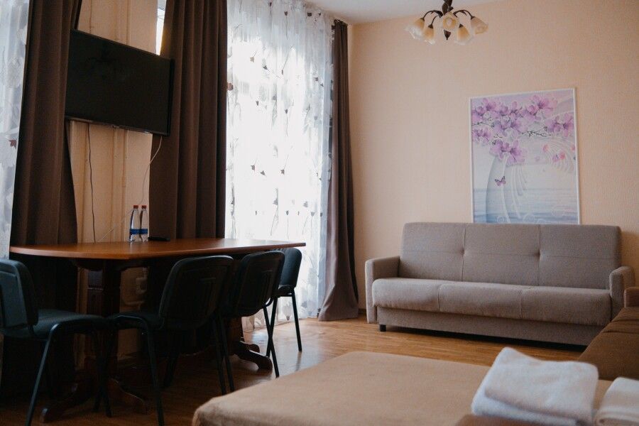 Гостиная с двумя раскладными диванами, кресло, телевизор. Санузел с ванной.