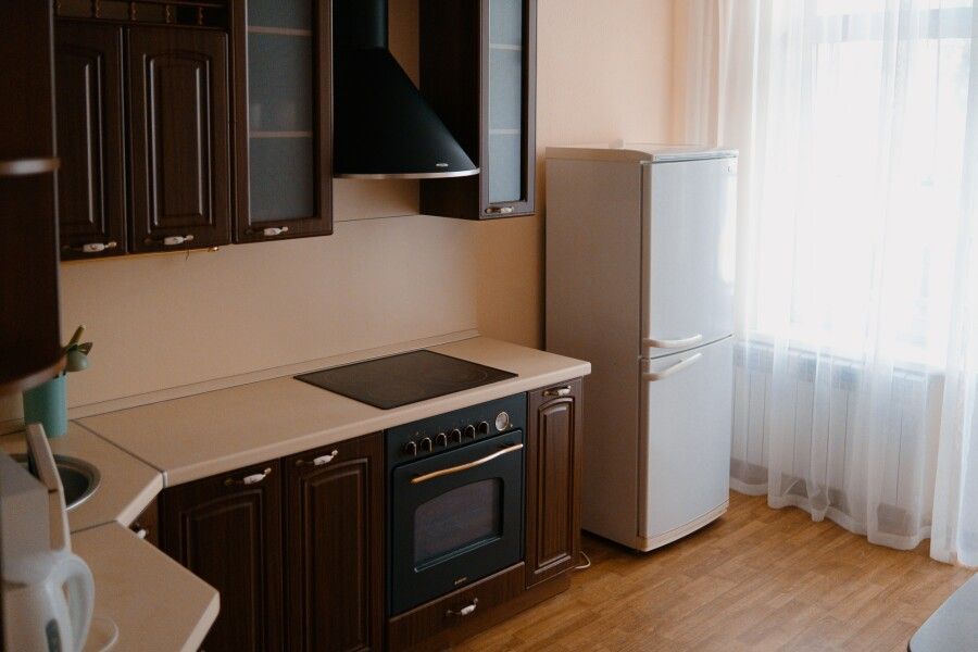 Укомплектованная кухня: плита, электрический чайник, холодильник.