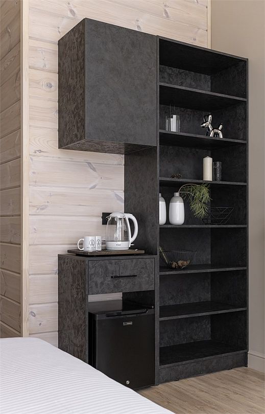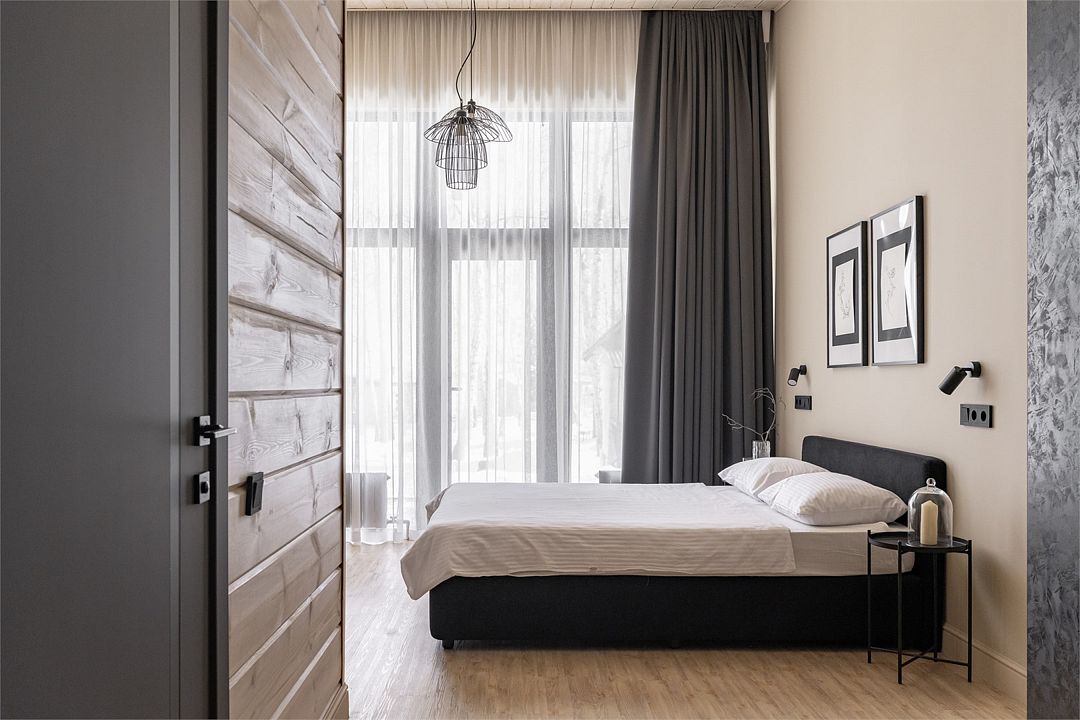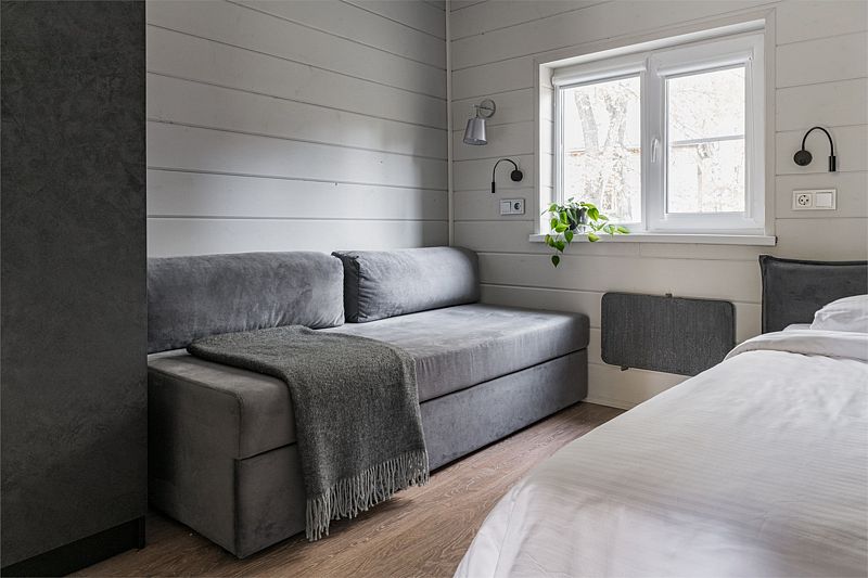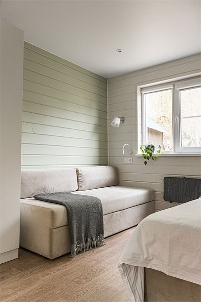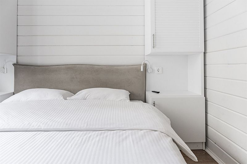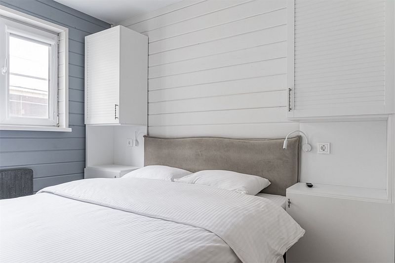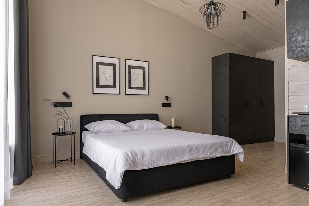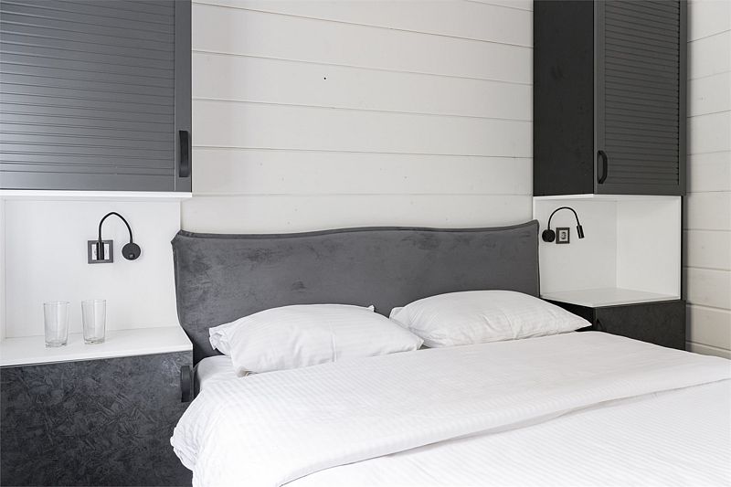 Одноэтажный деревянный коттедж категории 3 *** с современной мебелью и дизайнерским интерьером. Одна комната, ванная комната с душем. В комнате кровать 160*200 или