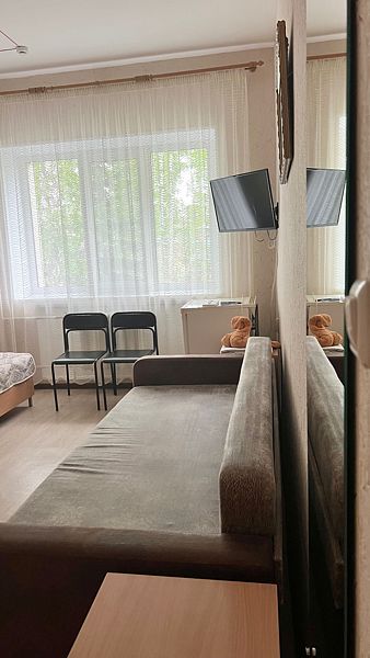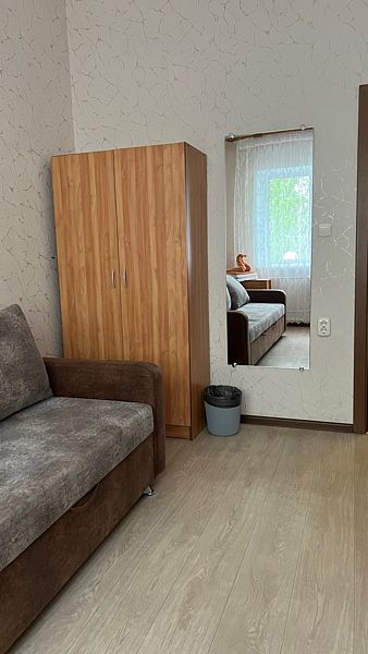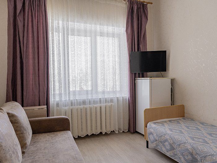 Номер соответствует I категории классификации номеров, имеет площадь 12м2, оснащен необходимой для комфортного проживания мебелью и техникой: шкаф для одежды, диван-кровать, одна односпальная кровать размером 90*200, телевизор, холодильник, стол, стулья, постельные принадлежности, полотенце на каждого гостя предоставляются бесплатно. Собственная ванная комната. По запросу гостей предоставляется чайник, необходимая посуда. Ежедневная уборка номера. Смена постельного белья 1 раз в 3 дня, либо по просьбе гостя. Максимальное количество гостей 2