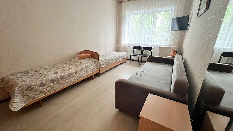 Номер соответствует II категории классификации номеров, имеет площадь 18м2, оснащен необходимой для комфортного проживания мебелью и техникой: шкаф для одежды, диван-кровать, две раздельно стоящие кровати размером 90*200, телевизор, холодильник, стол, стулья, постельные принадлежности, полотенце на каждого гостя предоставляются бесплатно. Ванная комната с душем одна на два номера. По запросу гостей предоставляется чайник, необходимая посуда. Ежедневная уборка номера. Смена постельного белья 1 раз в 5 дней, либо по просьбе гостя. Максимальное количество гостей 4