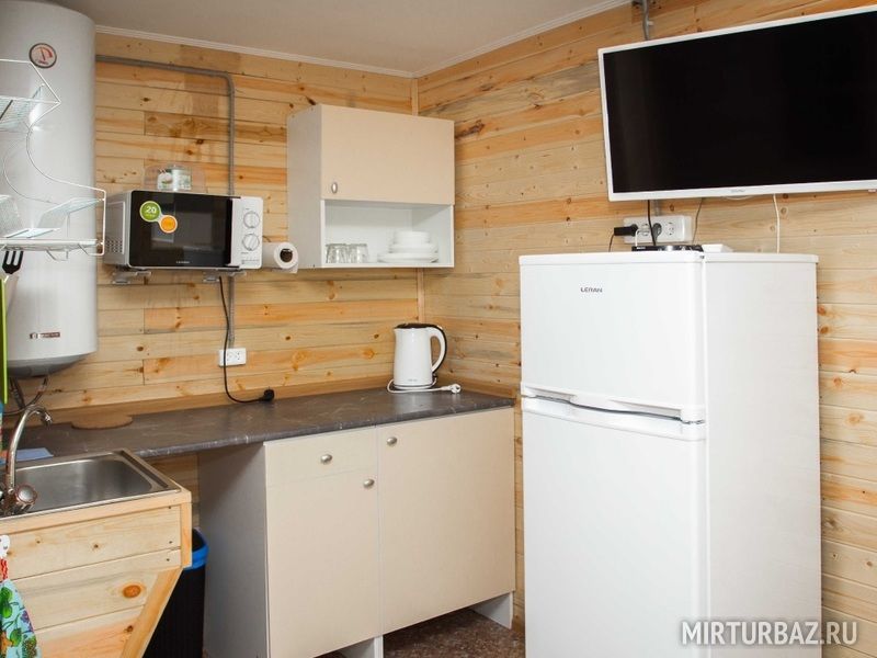 Новые апартаменты оснащены всем необходимым для комфортного отдыха. На первом этаже расположена небольшая кухонная зона с холодильником, микроволновой, чайником и телевизором. Туалет и душевая так же на первом этаже.