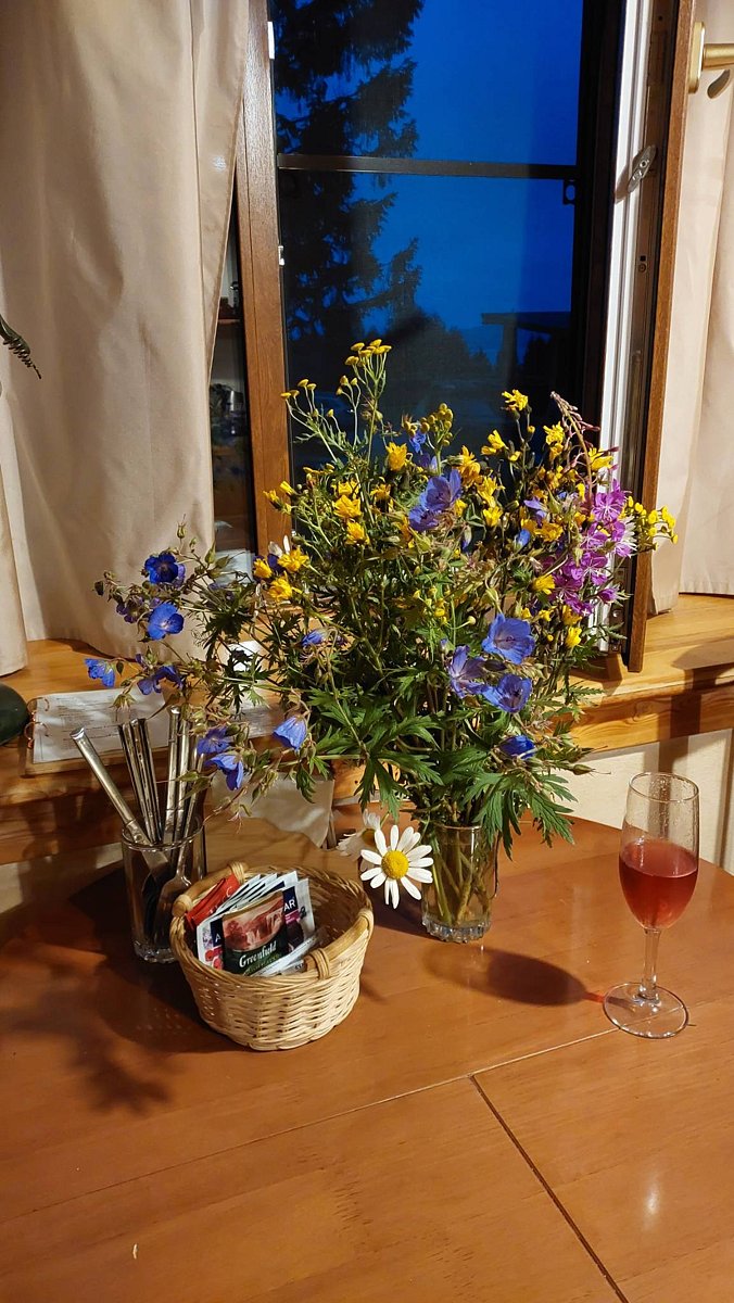 Номер с тремя односпальными кроватями, есть возможность совместить. Санузел в номере с ванной. Кухонная зона на втором этаже, в общем зале, для двух номеров. Для каждого номера своя плита, посуда, холодильник, чайник, микроволновка, стол, столовые приборы. Листовой чай (черный с травами, зеленый с