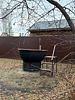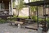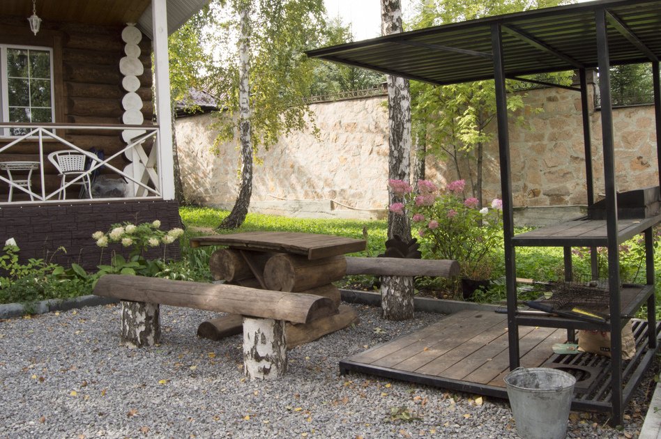 Рядом с домом установлен мангал. Есть шампура, казан и столовые приборы.
