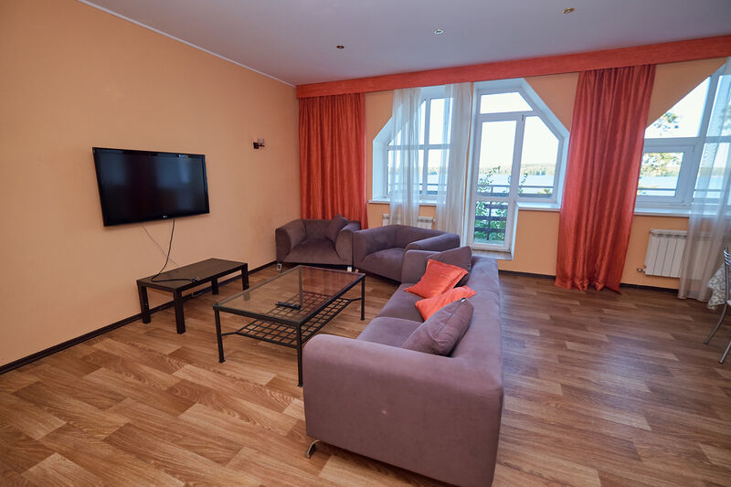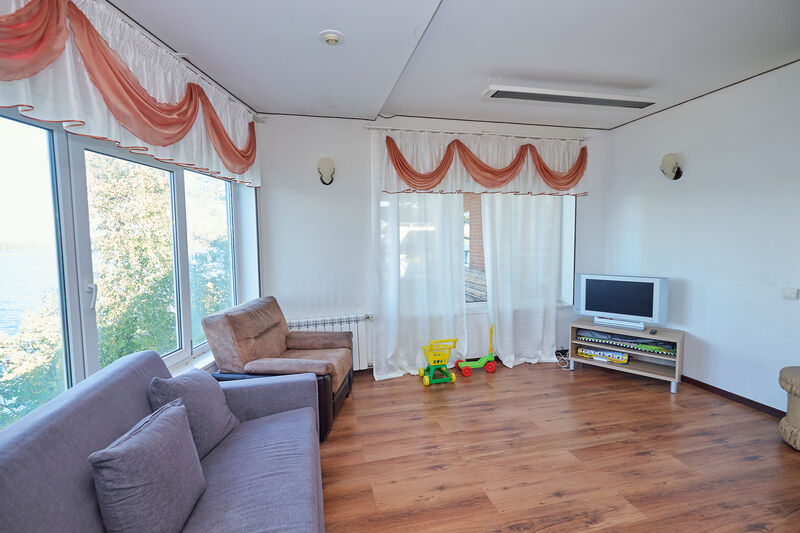 Лоджия с круговым остеклением и видом на озеро: 2х диван (можно под спальное место), ТВ.