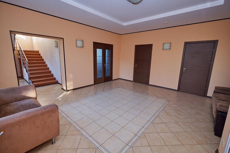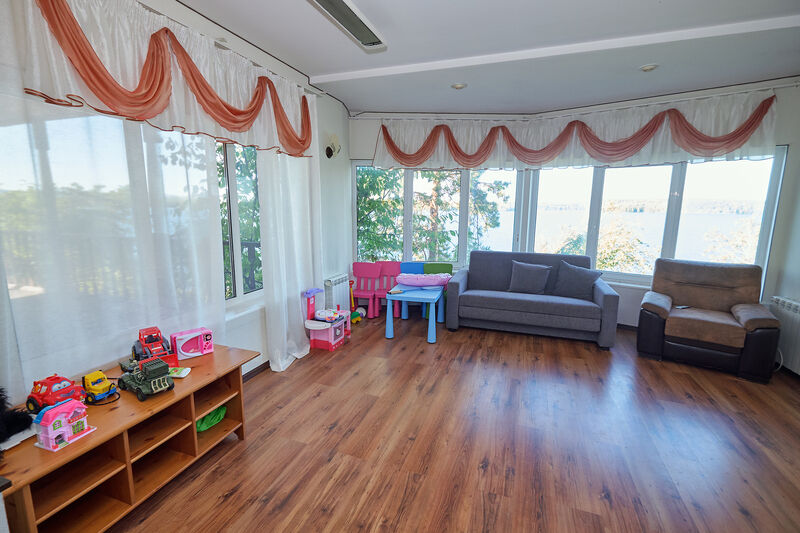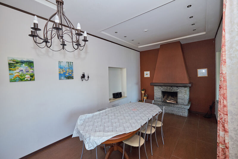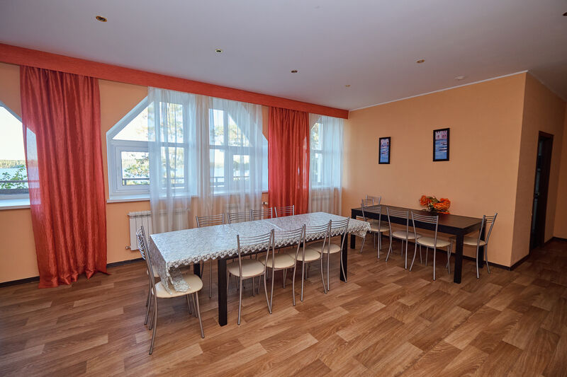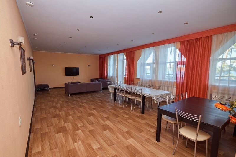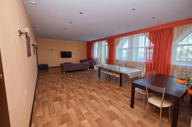 Банкетный зал с зоной отдыха: 2 длинных стола на 22-24 чел (+ кухонный стол на 4 чел), большой ТВ (возможность смотреть фильмы с USB-флешки) с антенной на 20 ТВ каналов, музыкальный центр (USB, AUX).
