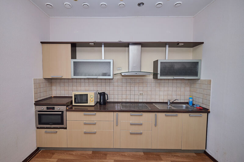 Кухня: Холодильник, духовка, микроволновка, стол.