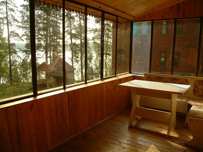 В бане расположены: парилка, комната отдыха с камином, самоваром, телевизором, холодильником, феном, душевая, теплая терраса с панорамным видом на озеро, туалетная комната