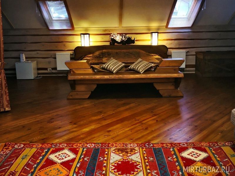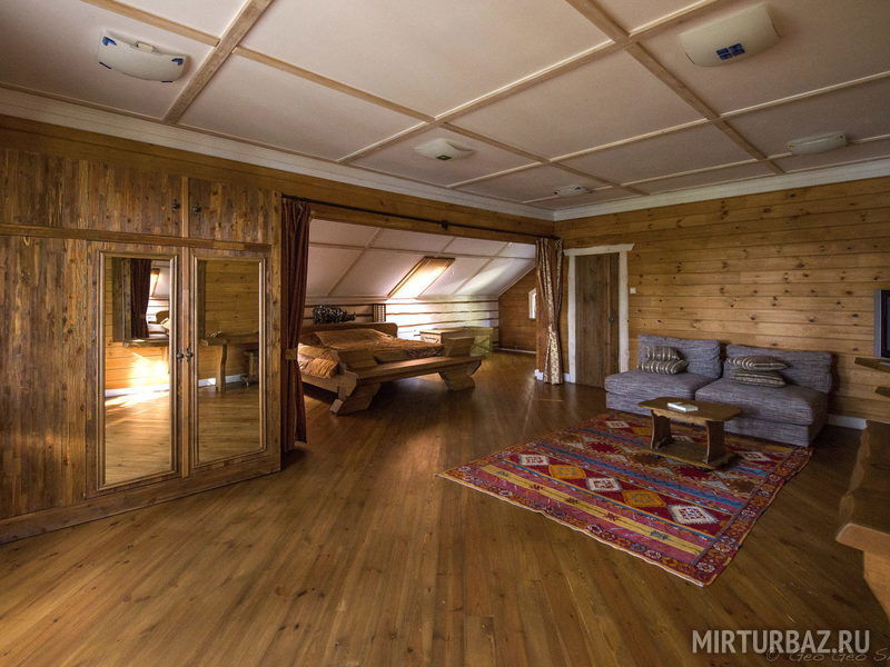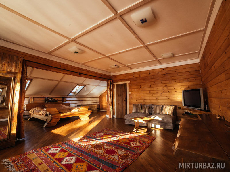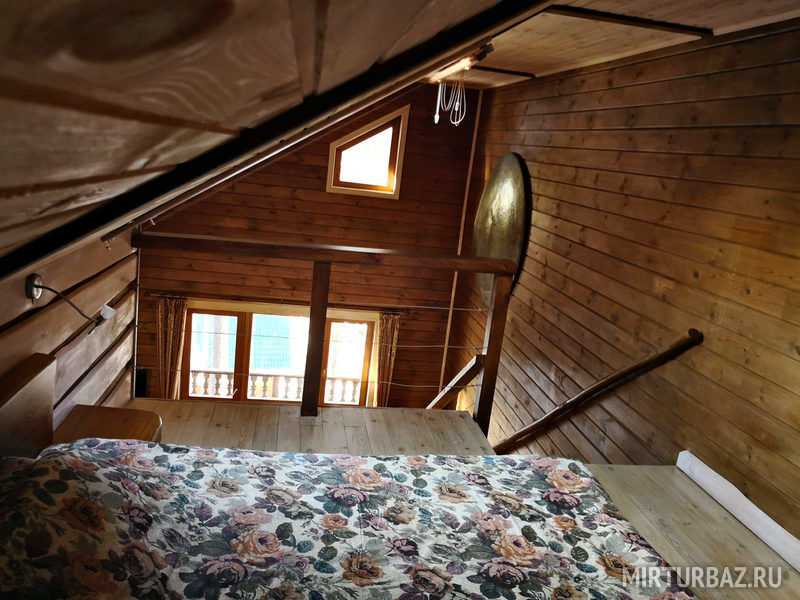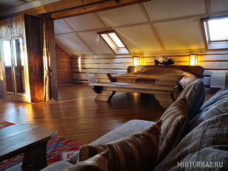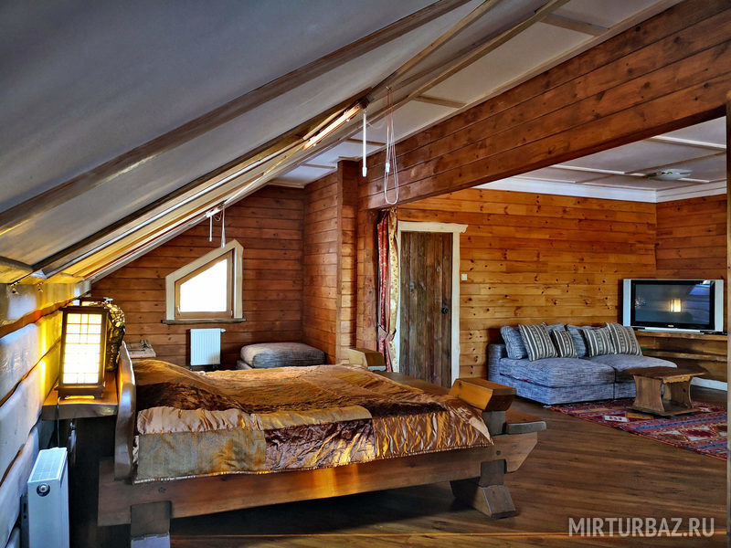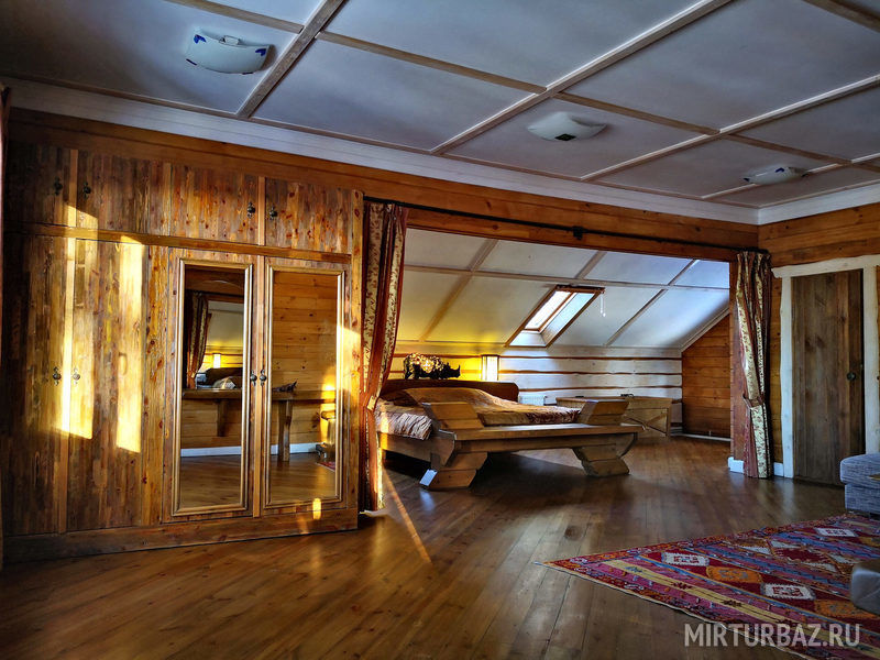 "Индиана Джонс" — двухместный двухуровневый номер 87 м², с ванной и душевой кабиной, телевизор (спутниковое ТВ), диван, вид на озеро Тургояк и на гору. Балкон. Третий этаж. Большая двуспальная кровать.