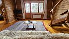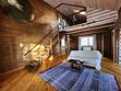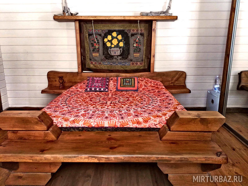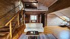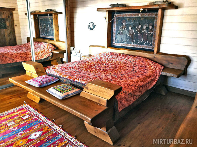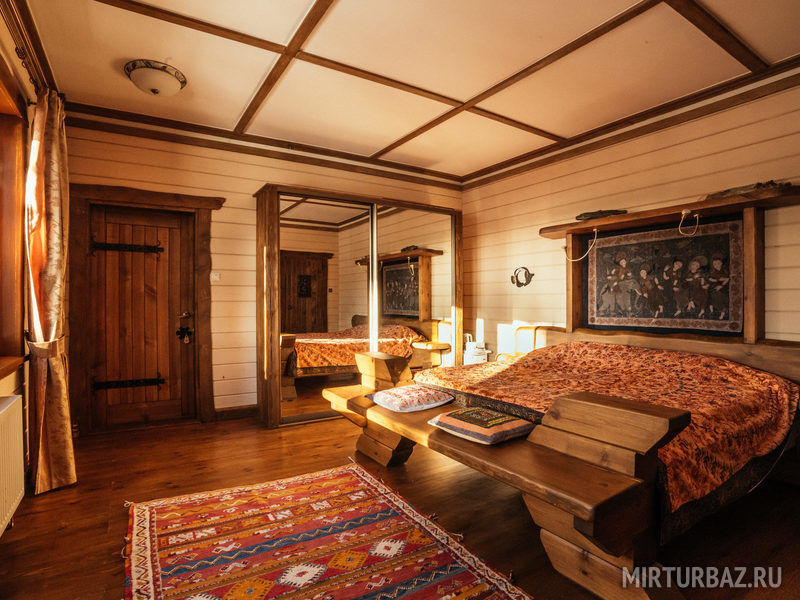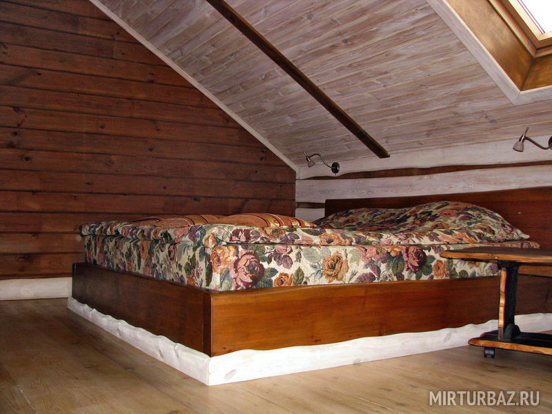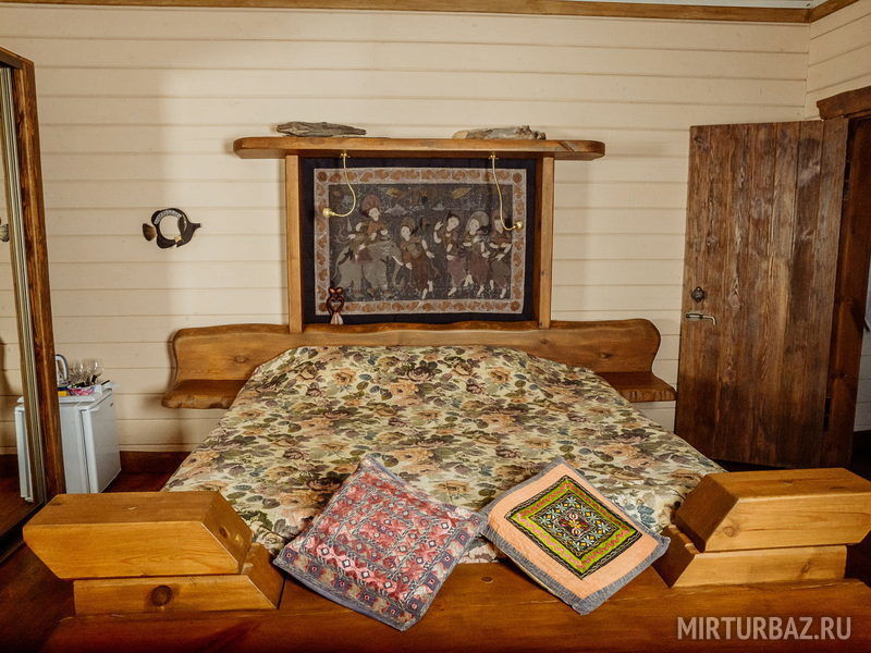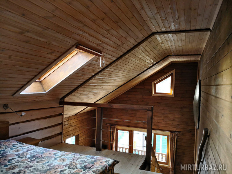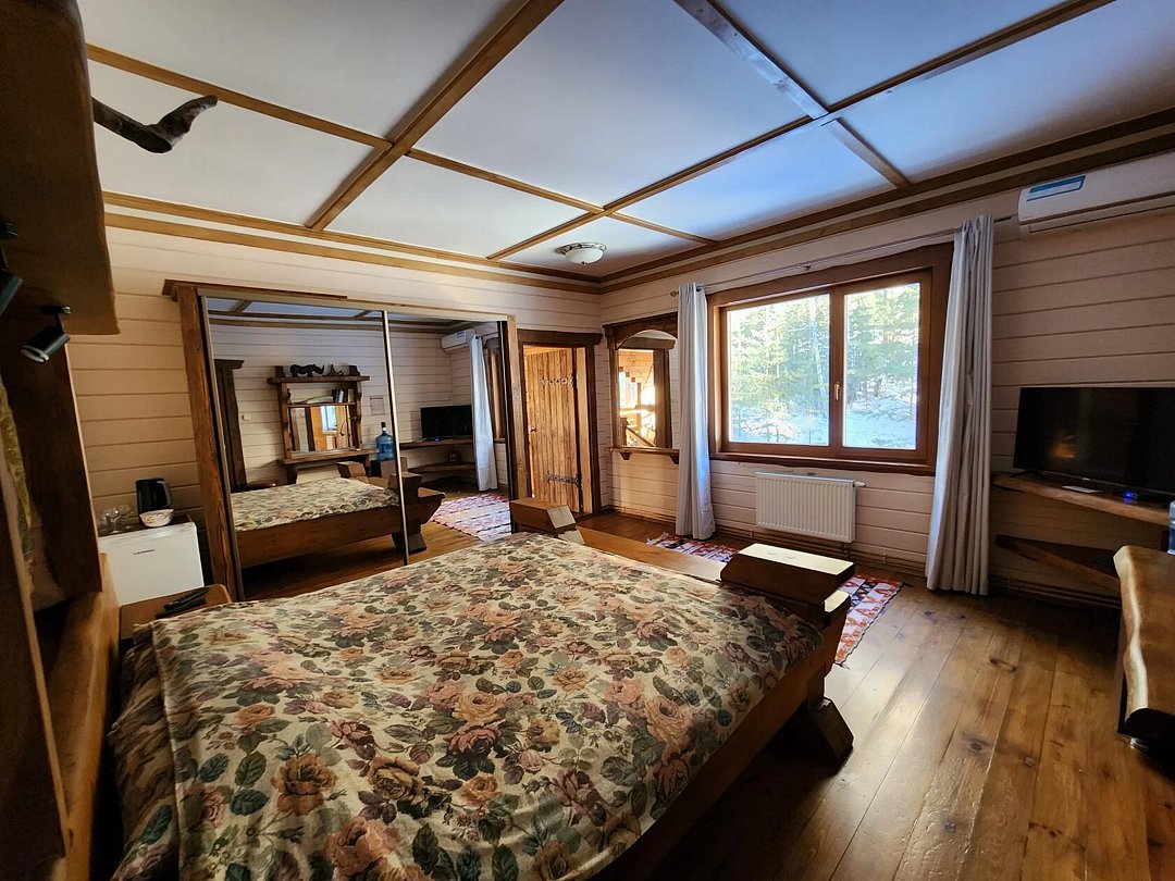 "Индиана Джонс" — двухместный двухуровневый номер 87 м², с ванной и душевой кабиной, телевизор (спутниковое ТВ), диван, вид на озеро Тургояк и на гору. Балкон. Третий этаж. Большая двуспальная кровать.