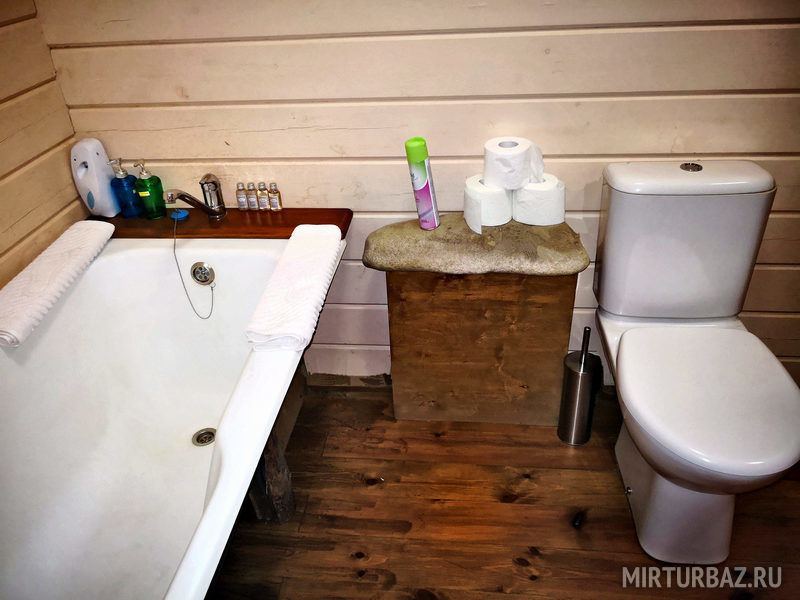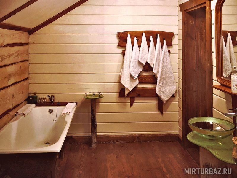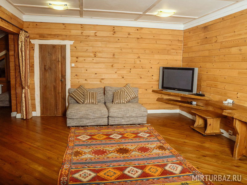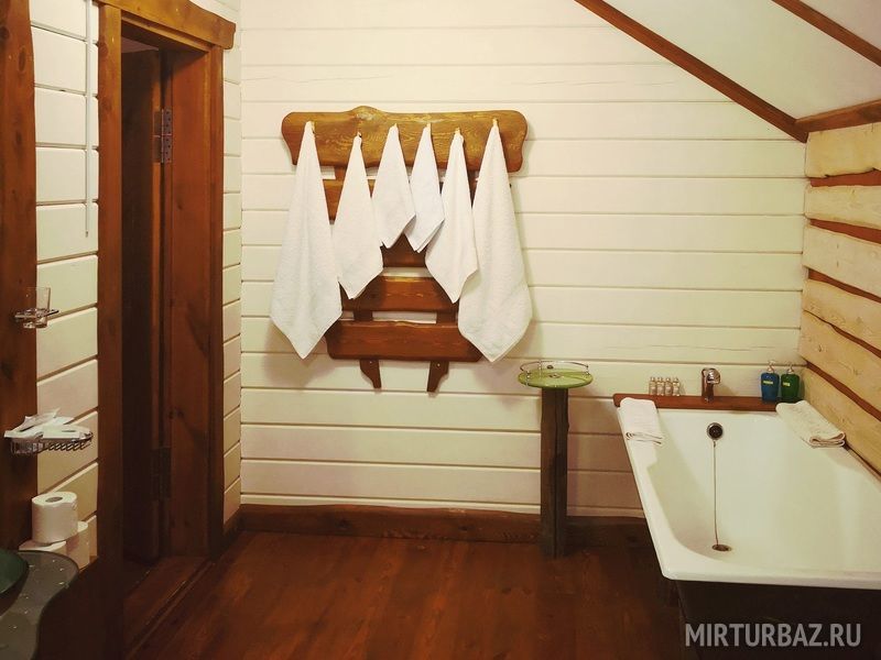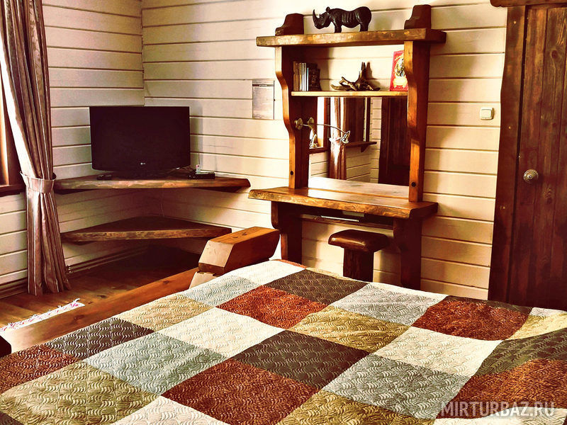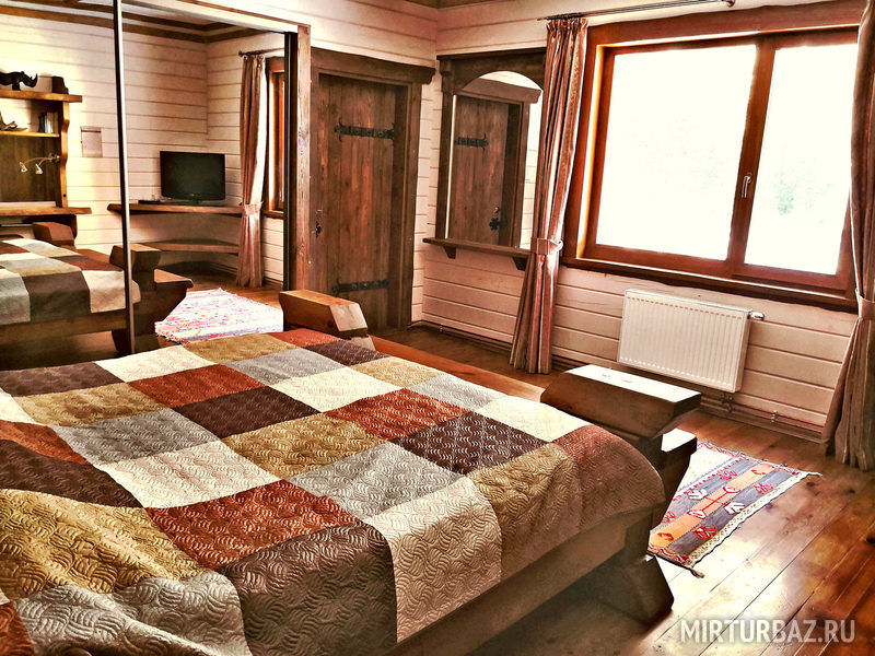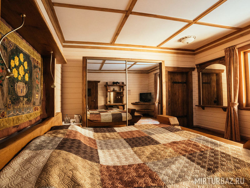 «Барон Мюнхгаузен» — двухместный номер 32 м² с ванной и душевой кабиной, телевизор (спутниковое ТВ), вид на гору и лес. Второй этаж. Без балкона. Большая двуспальная кровать.