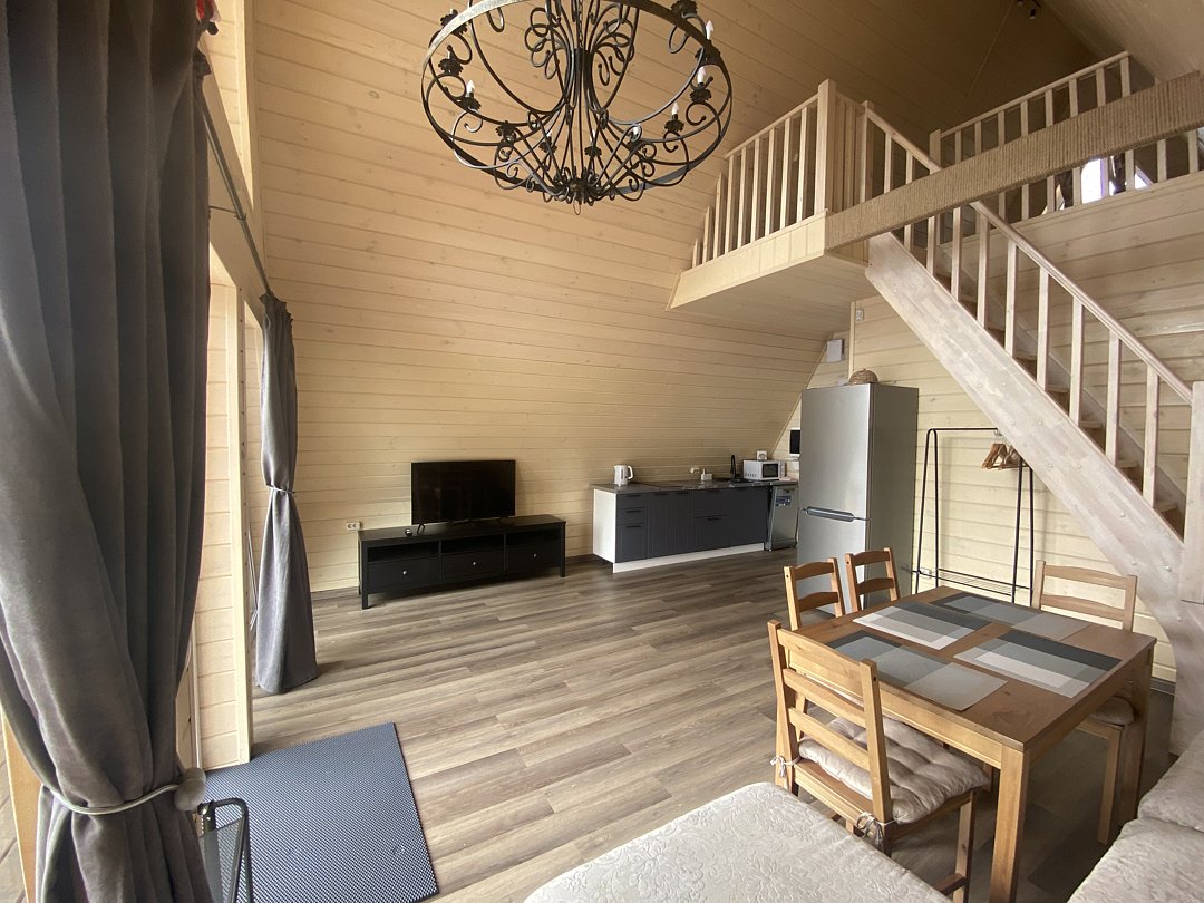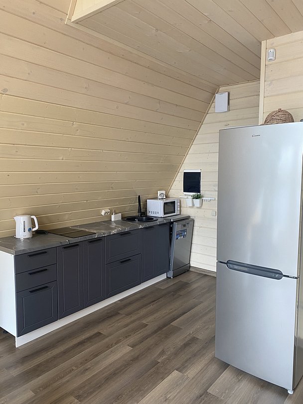 Дом в стиле А-фрейм рассчитан на 6 гостей, возможно разместить 3 детей без предоставления места. В спальне 2-х спальная кровать, в гостиной диван раскладывающиеся, на 2 этаже 2-х спальная кровать. На кухне есть все необходимое для комфортного проживания.