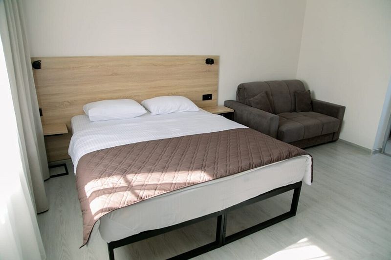 В номере: прихожая, кухня-столовая и спальня. Для удобства есть мягкая мебель, Smart TV, СВЧ, холодильник, минимальный набор посуды. Проживающие в этой категории номера могут воспользоваться мангальной зоной.