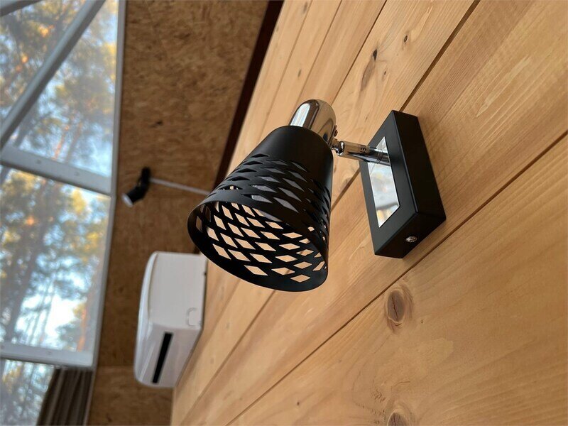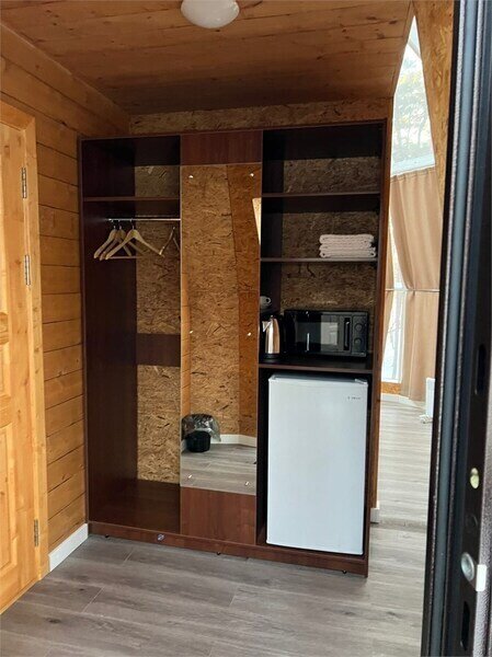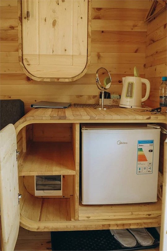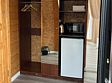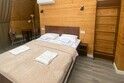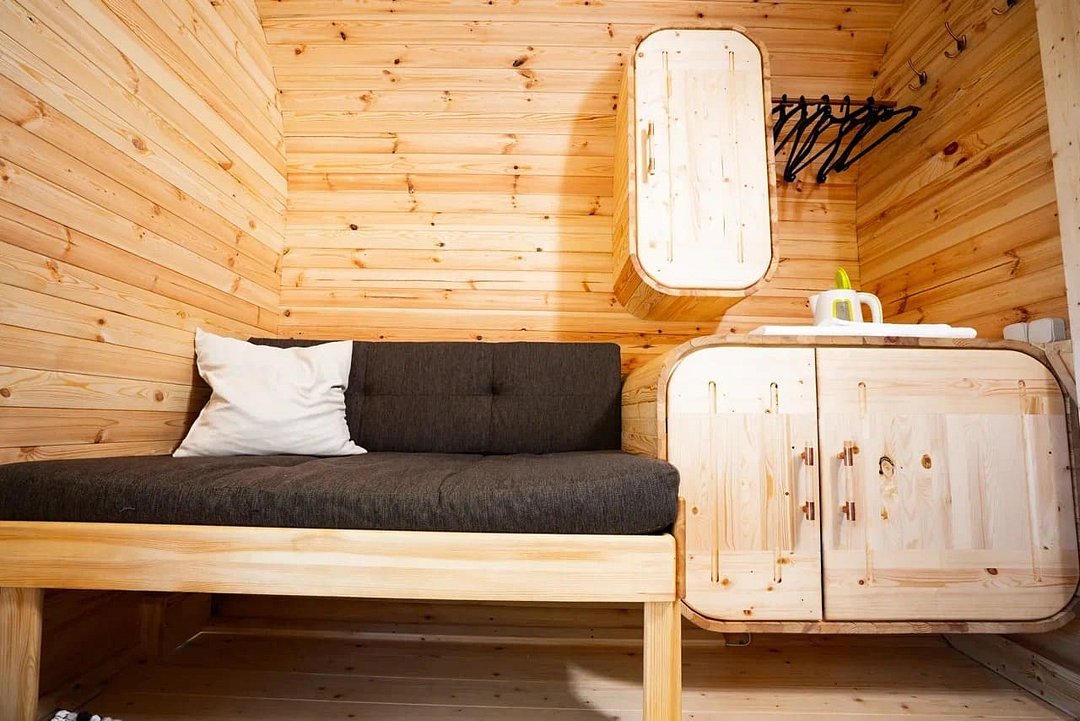 Домик создан из экологически чистых материалов, он уютный и тёплый. Внутри оборудован кондиционером, электричеством, есть двуспальная кровать и раскладной диванчик.
