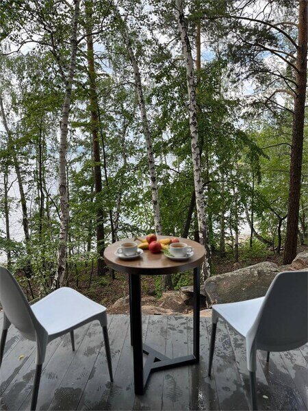 Дом-шале в скандинавском стиле с панорамным видом на лес и озеро Увильды, с собственной верандой и гамаком.