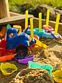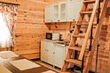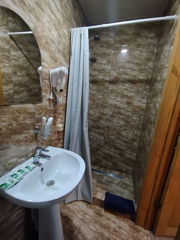 На первом этаже расположена кухонная зона (холодильник, микроволновка, чайник, набор посуды), обеденный стол, диван с телевизором, санузел с душевой кабиной.
