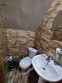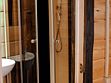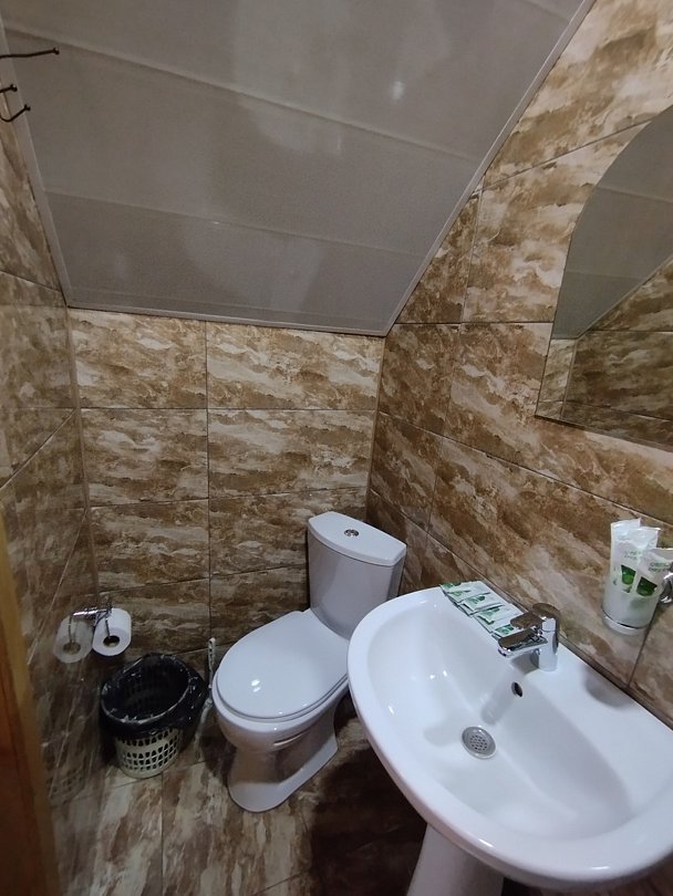 На первом этаже кухня (холодильник, чайник, микроволновая печь, чайный набор посуды), шкаф, санузел (душевая, раковина, зеркало, туалет).