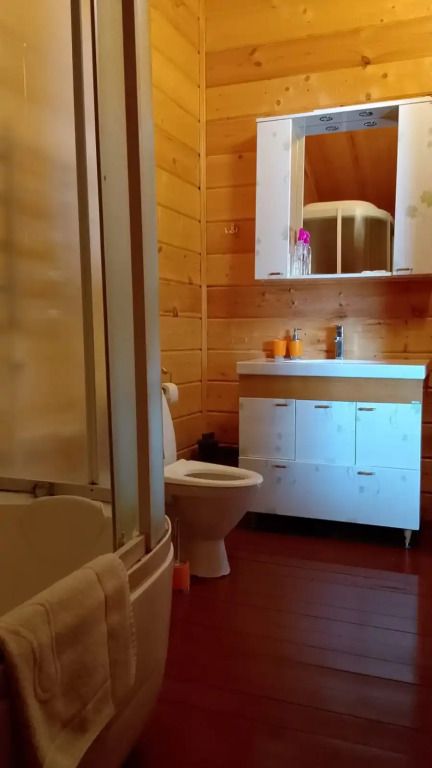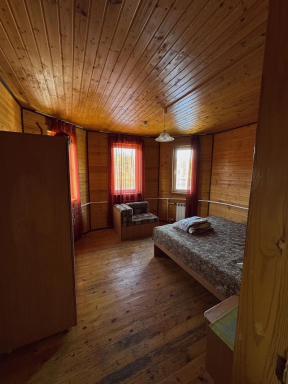 Уютный двухэтажный дом. Рассчитан до 8 человек. На первом этаже расположена гостиная: кухонная зона, оборудованная бытовой техникой, телевизор, большой мягкий диван, санузел и душевая кабина. На втором этаже – одна большая комната с двуспальной кроватью, двумя двуспальными диванами, балкон, летняя веранда.