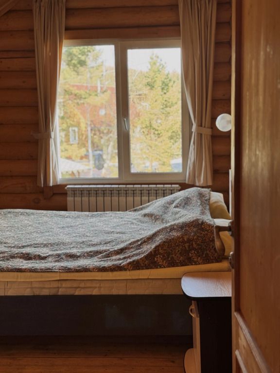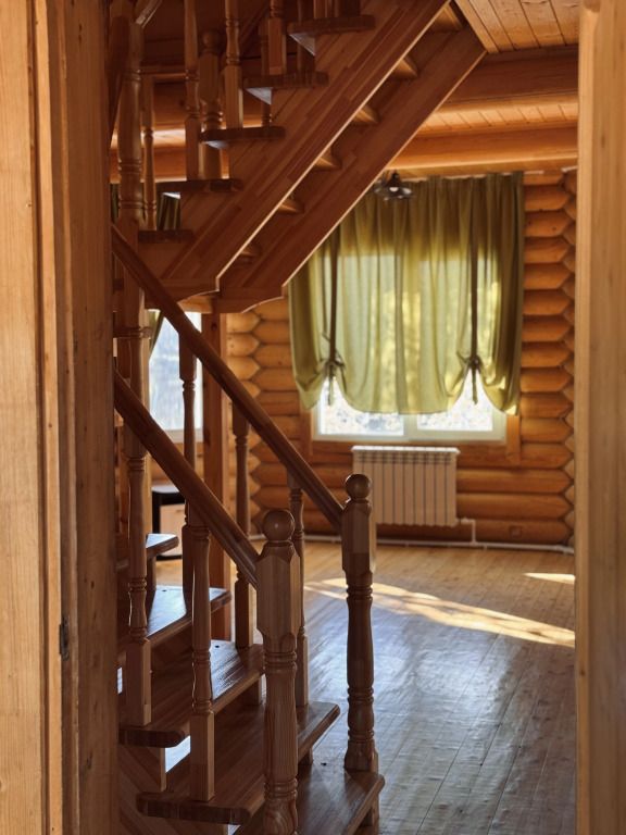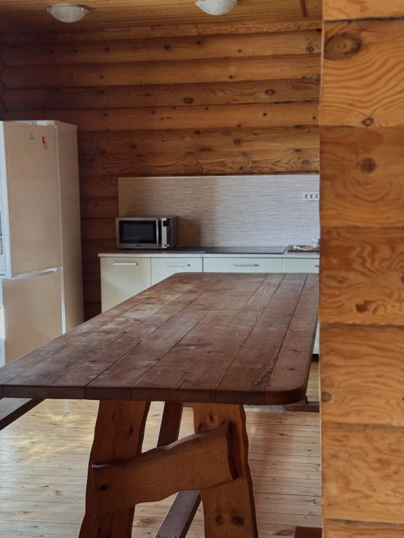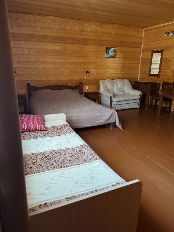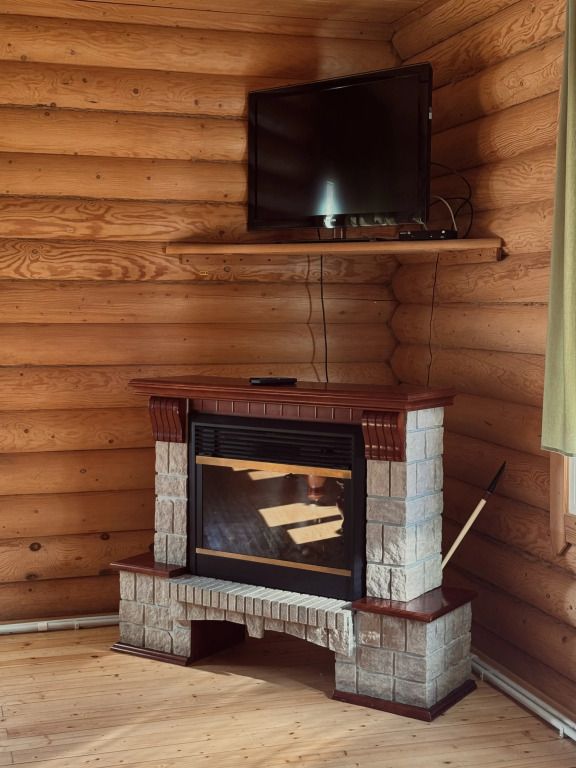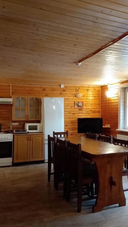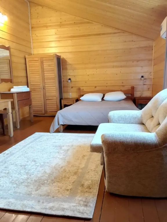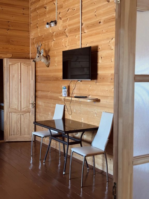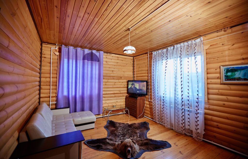 Двухэтажный коттедж выполнен в деревенском стиле, сруб изготовлен из натурального дерева. На первом этаже расположена просторная гостиная с телевизором, музыкальным центром, русским бильярдом и мягким диваном. В гостиной вы можете с удовольствием и пользой для здоровья провести досуг.