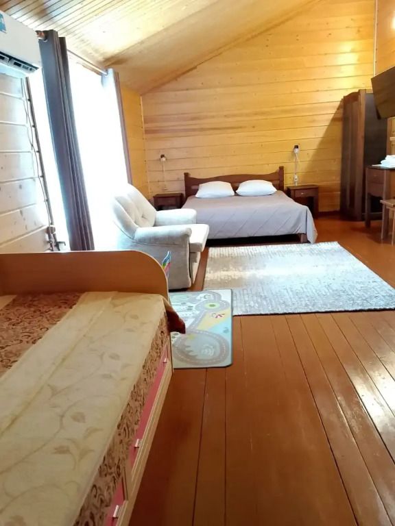 В номере: 2-х спальная кровать, 1.5 спальный диван, шкаф, тумба. Душевая кабина, санузел находятся в холле на 2 этаже.