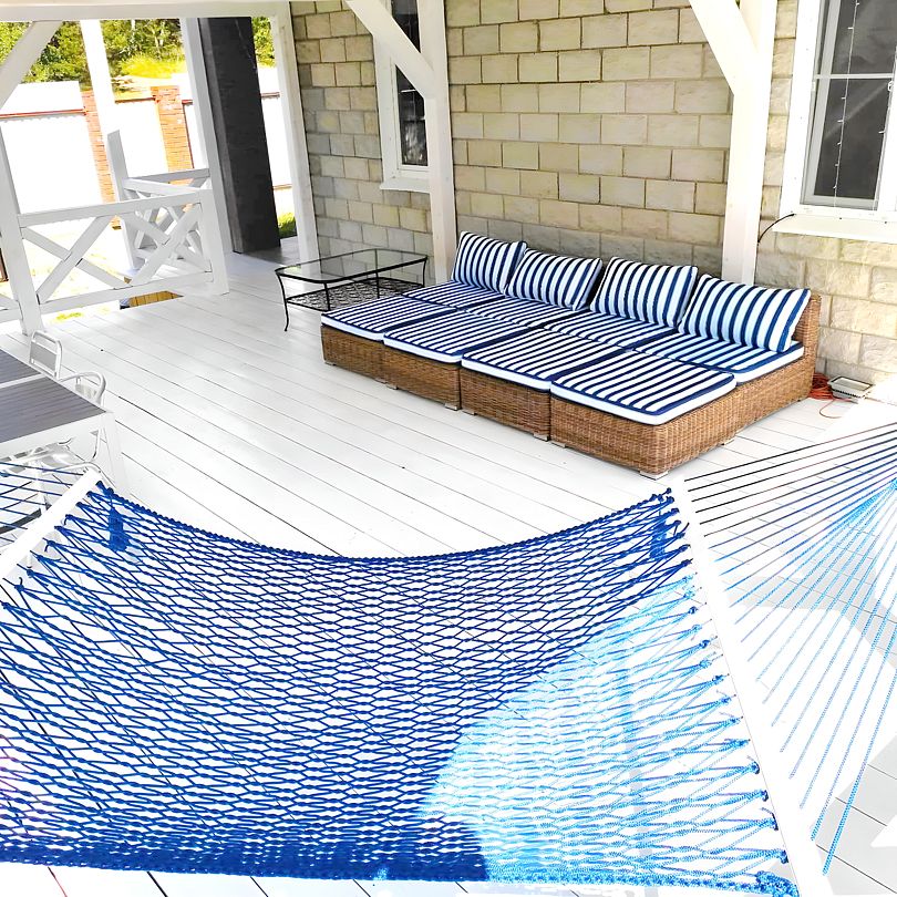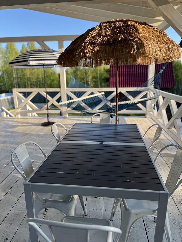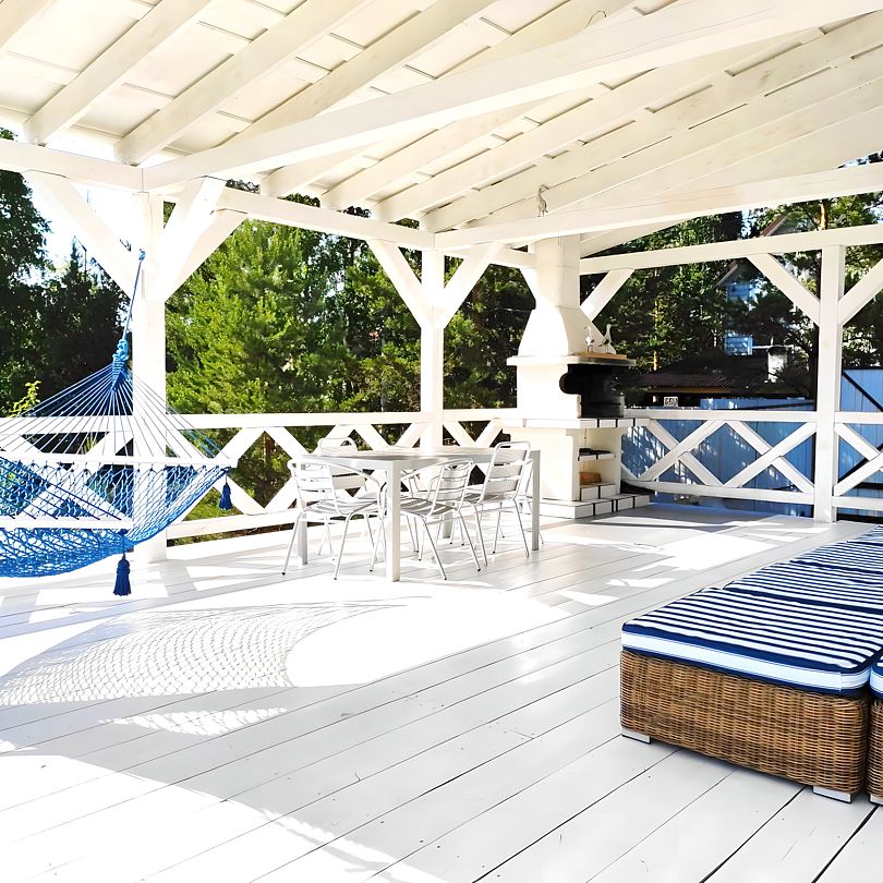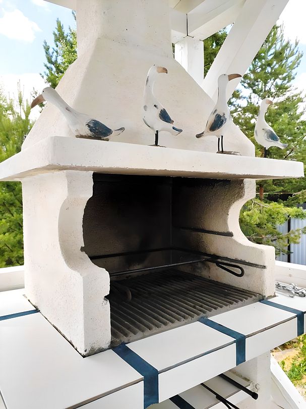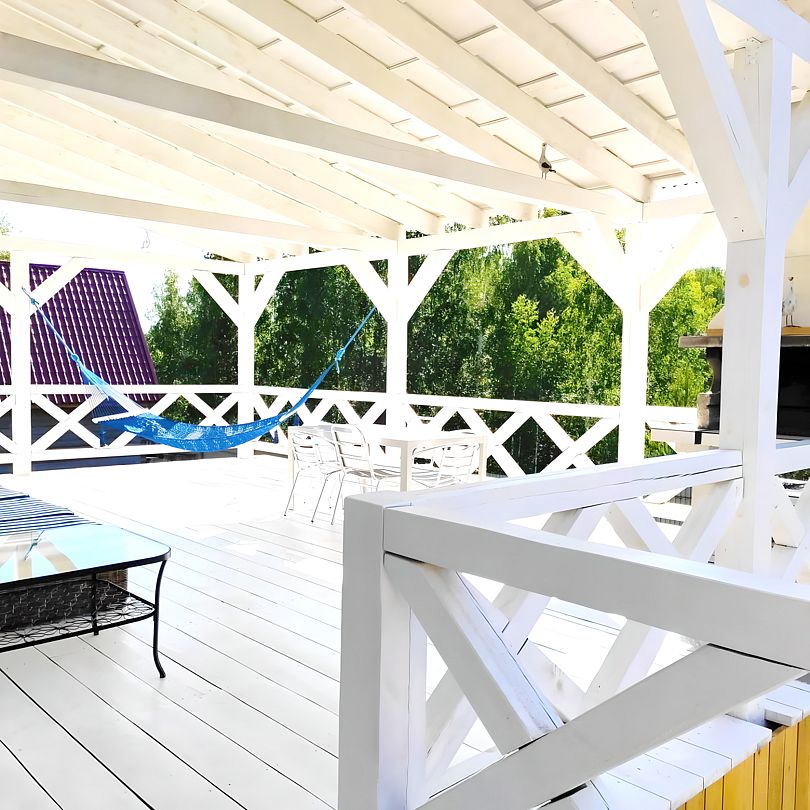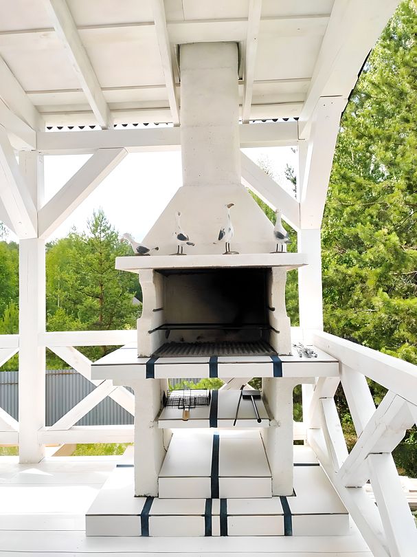В белоснежной беседке расположена барбекю-печь, которая приглашает гостей насладиться готовкой на свежем воздухе. Здесь можно отведать вкусные блюда за столом или расслабиться в гамаке и на шезлонгах.