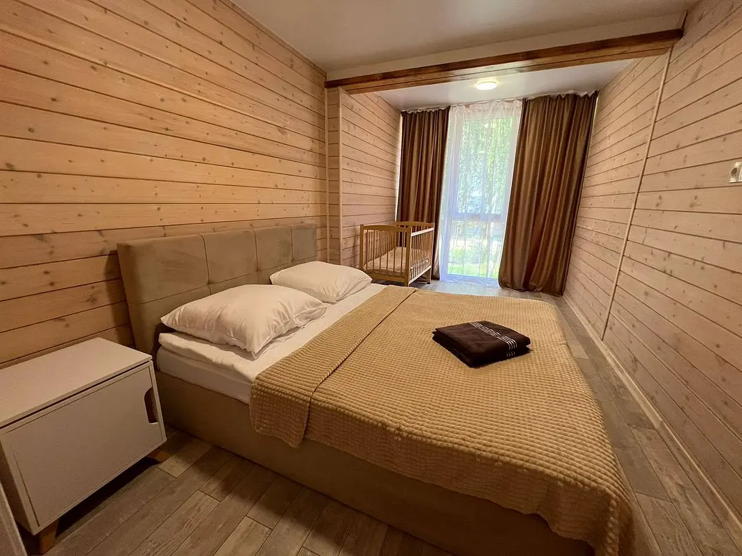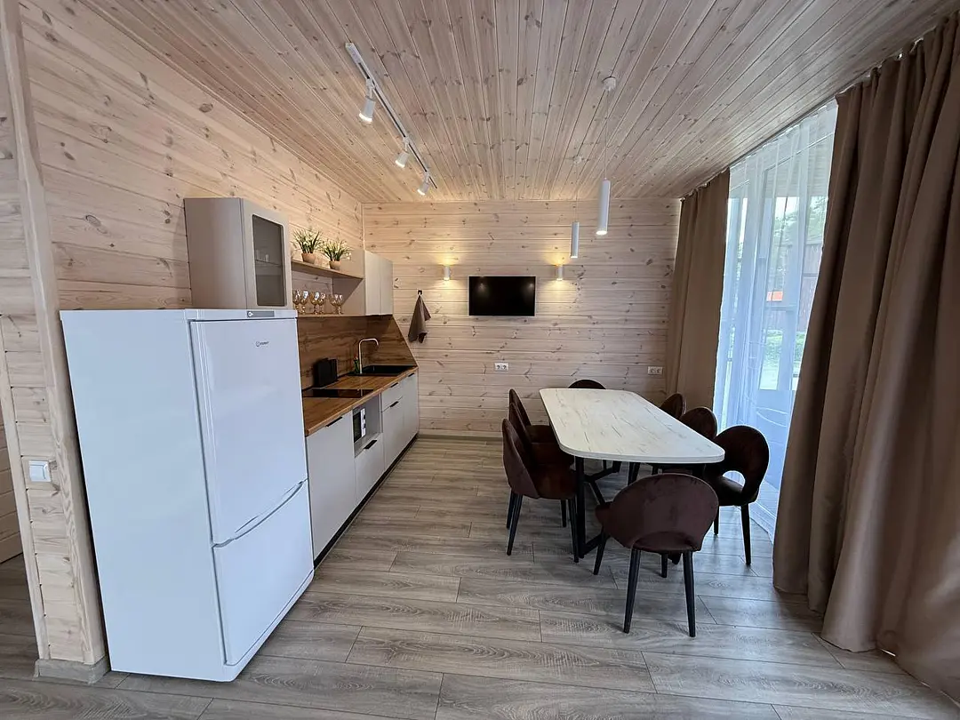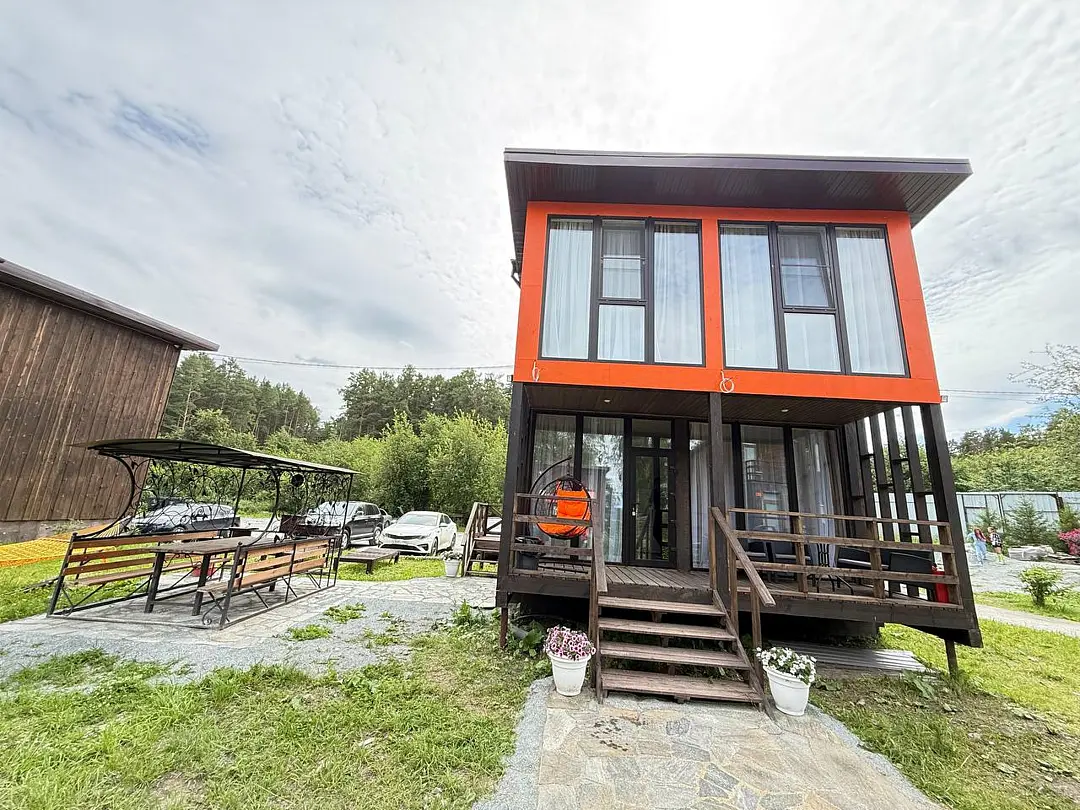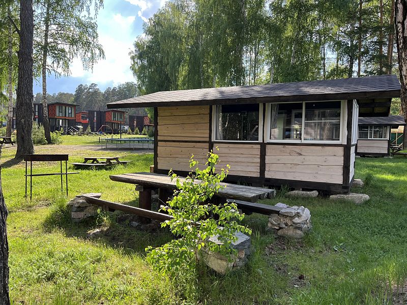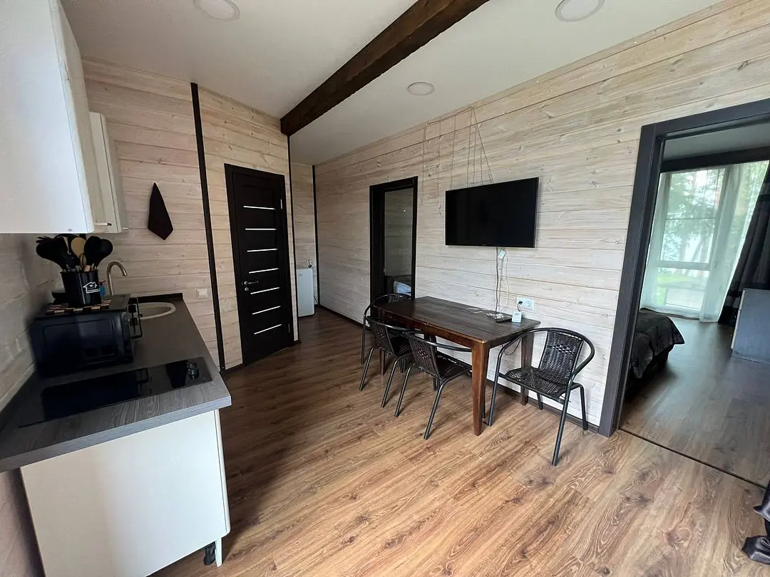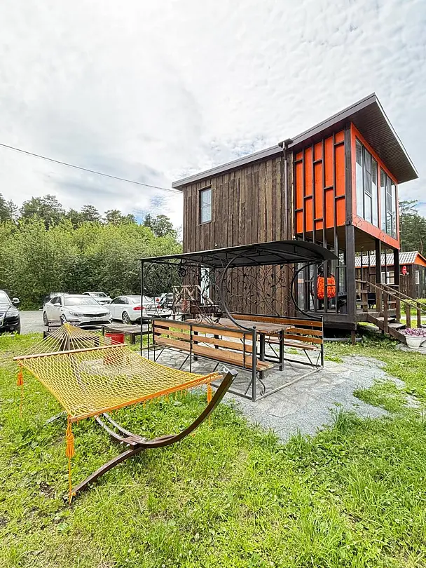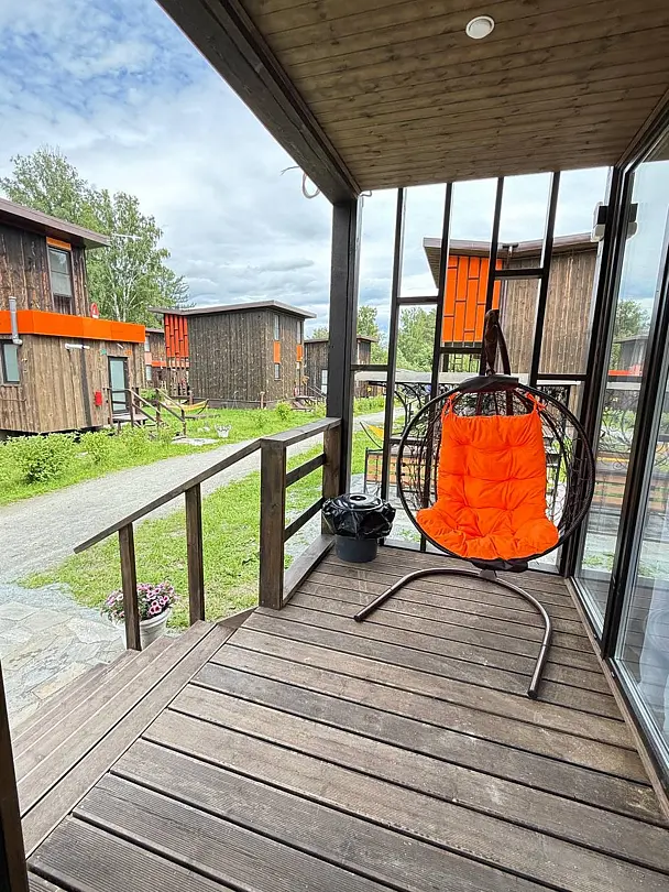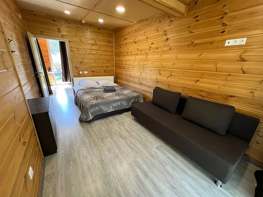 Семейный отдыхДостоинстваДомики новые. Еще есть запах свежего дерева и новой мебели. Всё как на фото в домике. Есть вся посуда для сервировки и приготовления пищи, но мы не пользовались, тк в местном кафе заказывали на вынос. Кстати: все по домашнему вкусно.