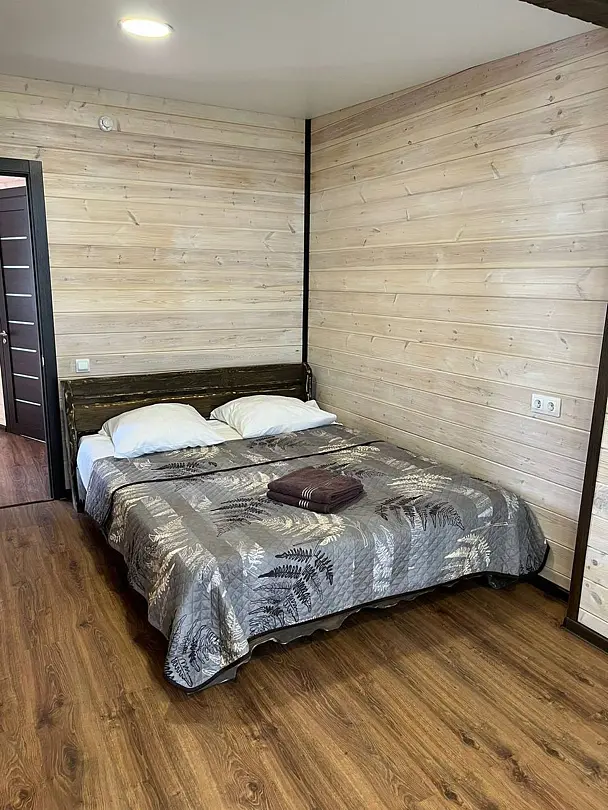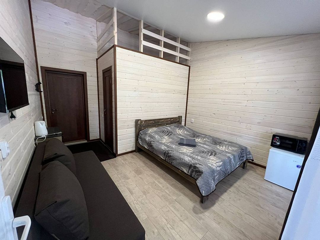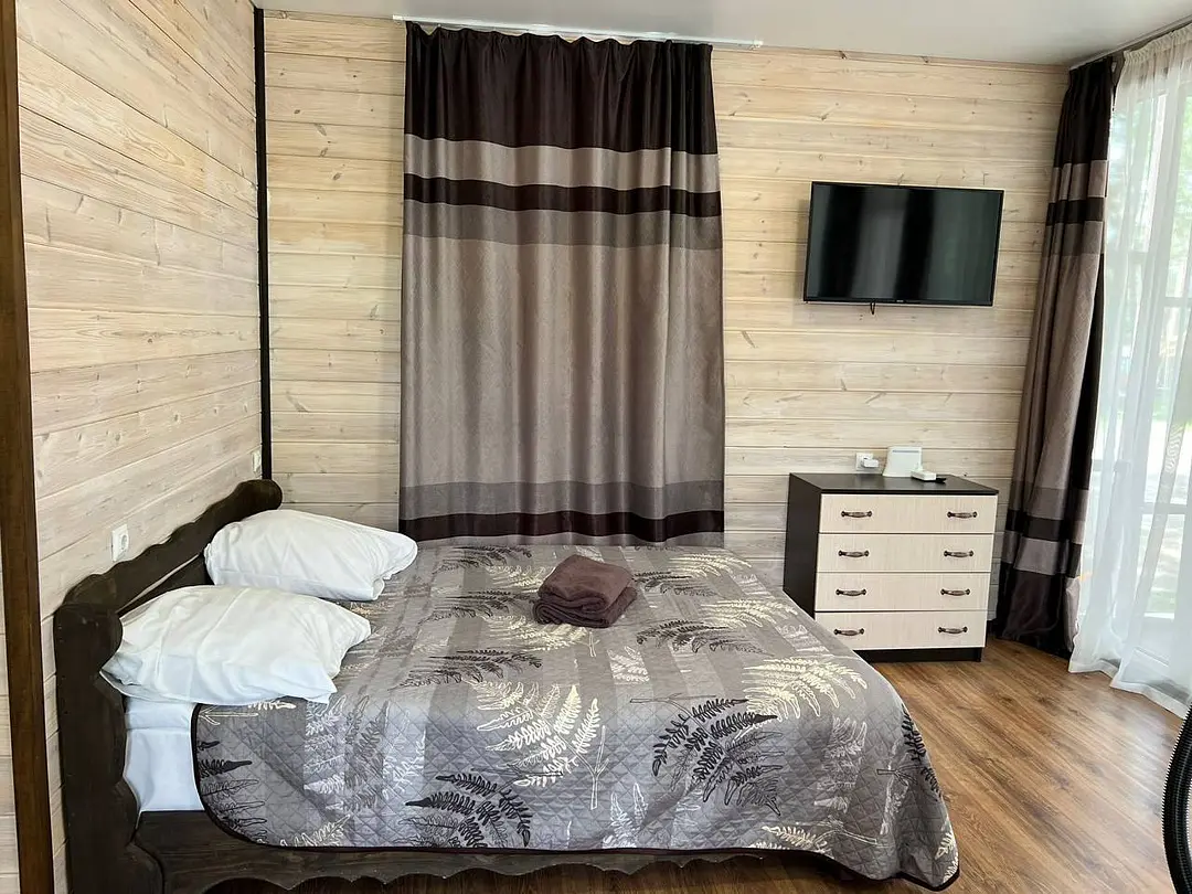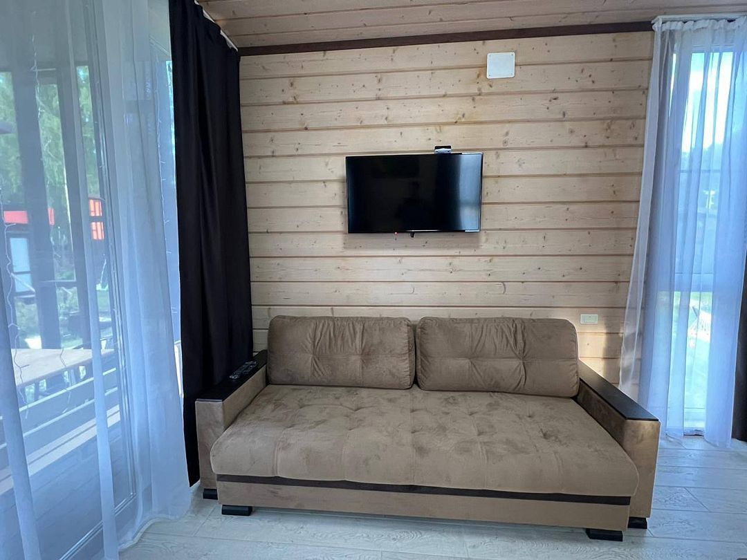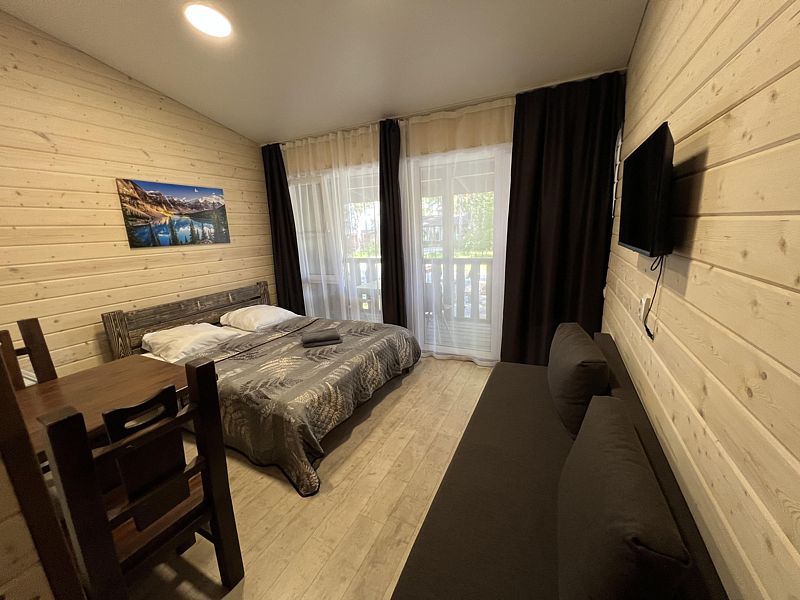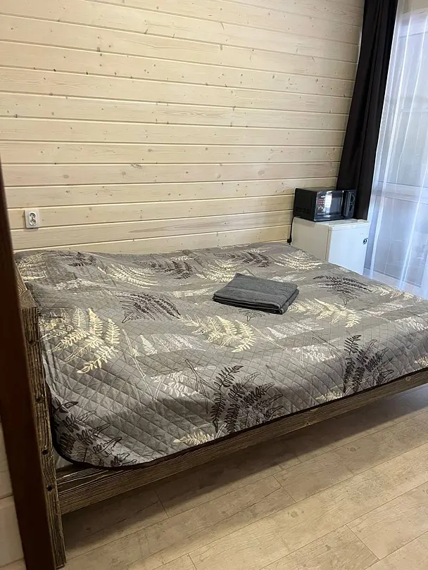 В номере: кровать и диван, ТВ, чайник, холодильник, микроволновая печь, душ, туалет, балкон, мангальная зона.
