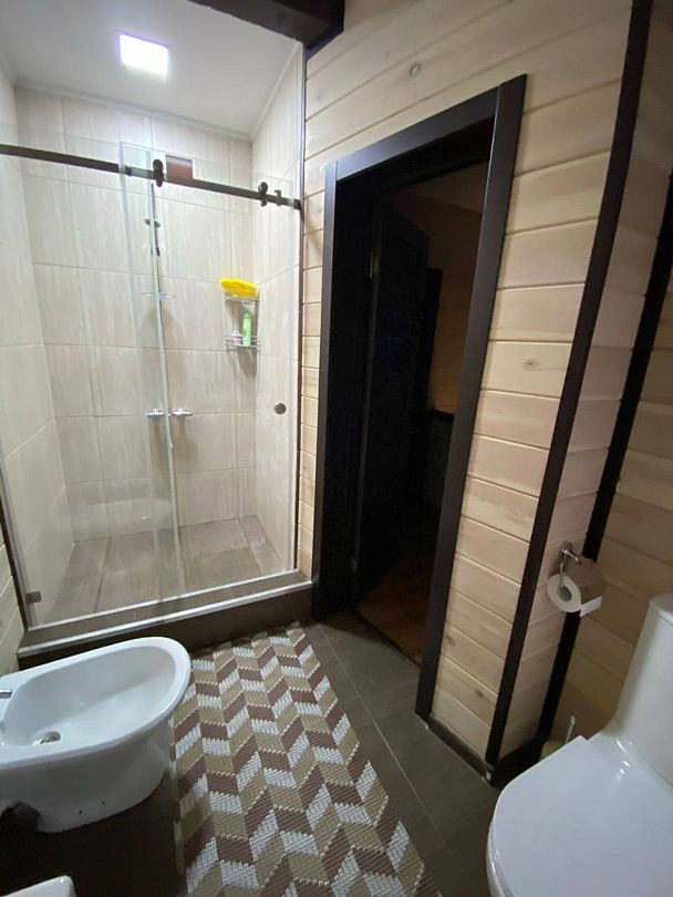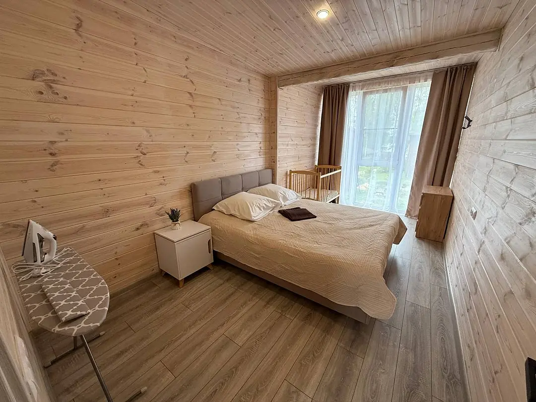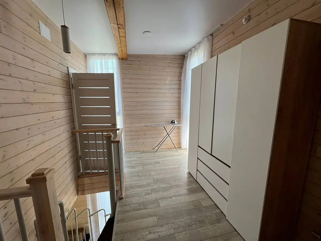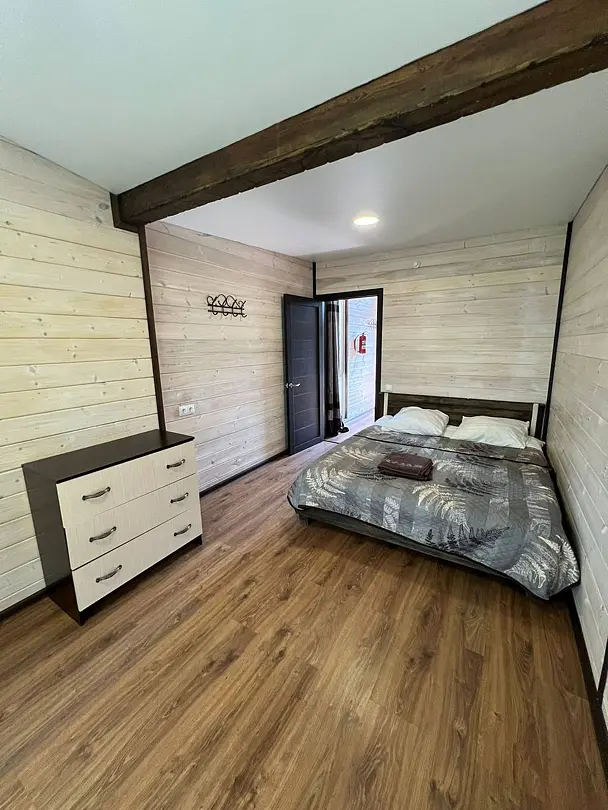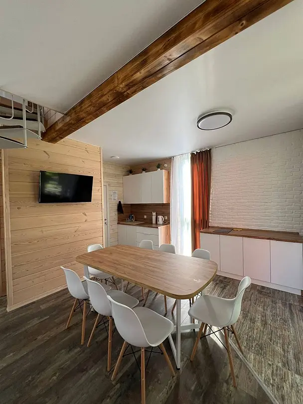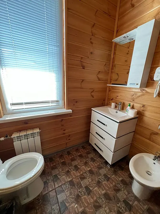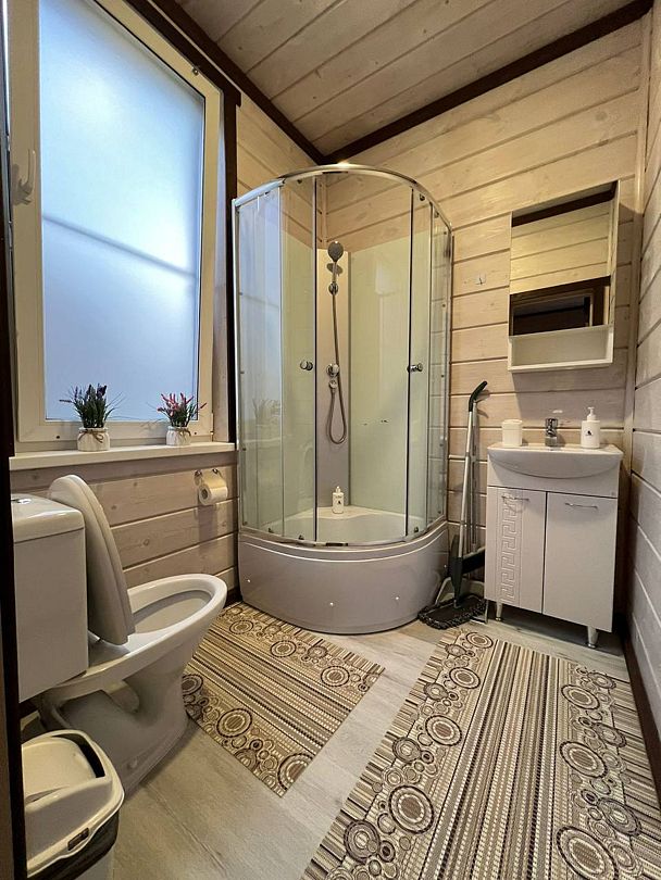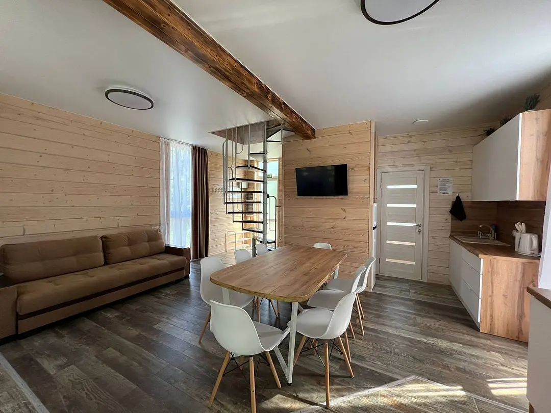 Двухэтажный дом со всеми удобствами. Первый этаж - кухня, гостинная, санузел, выход на веранду. Второй этаж - две спальни, санузел. Спальные места: в одной комнате - двуспальная кровать; в другой - кровать и диван; на первом этаже - двуспальный диван.