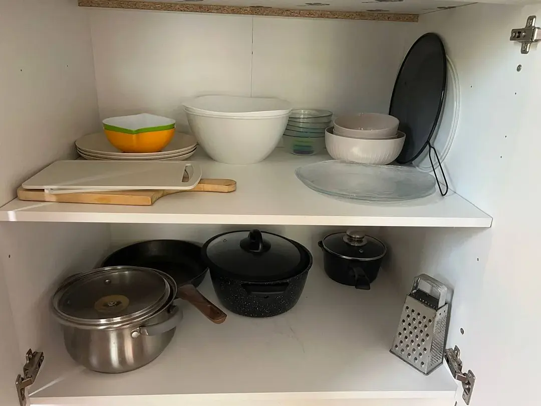 Есть тв, фен, чайник, микроволновая печь, холодильник, вся необходимая посуда для приготовления и приема пищи.