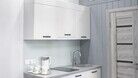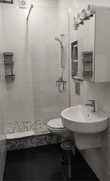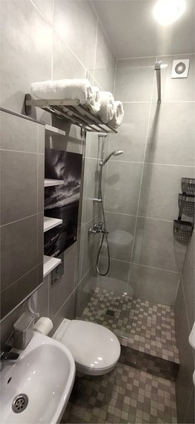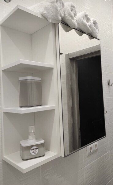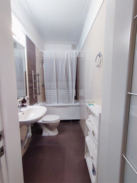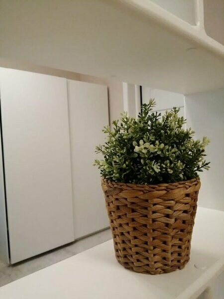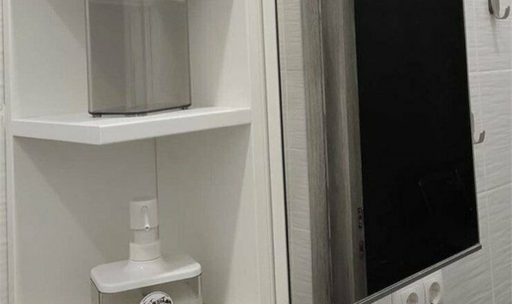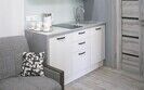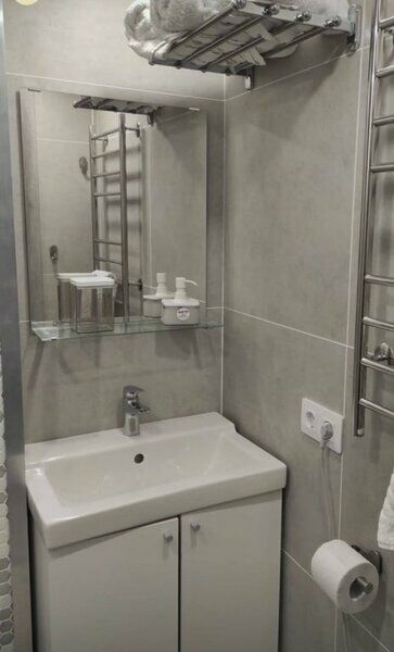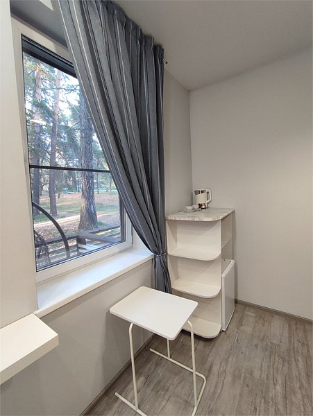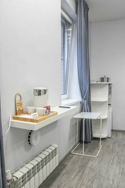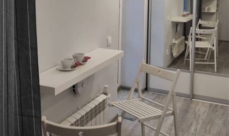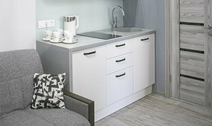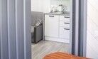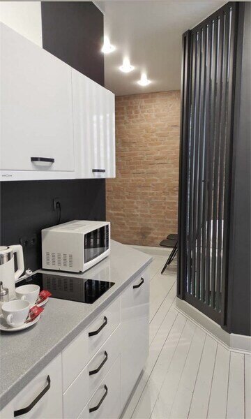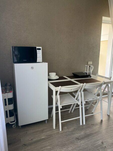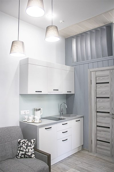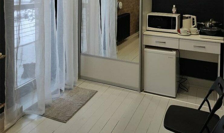 Комфортно разместиться в апартаментах студия смогут 3 человек (две односпальные кровати и антресоль).