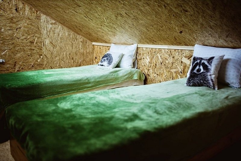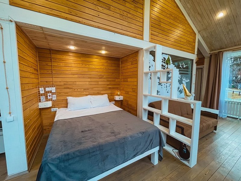НедостаткиНе понравилось, что в домике все хлипкое. Свет то включался, то не включался, лампочка мигала. Позвонили администратору. Пришел электрик починил. Диван проваливался, лестница с узкими ступеньками, не по стандарту, очень крутая даже для взрослого) Если с маленькими детьми, то проблематично.