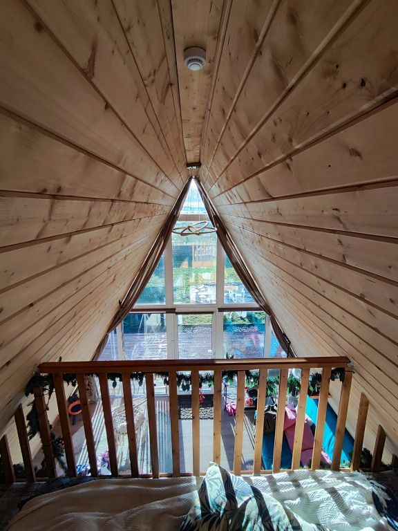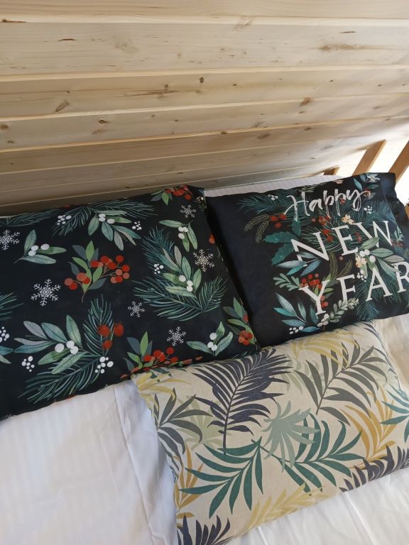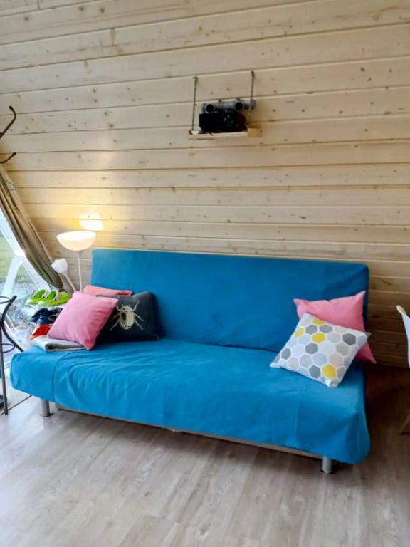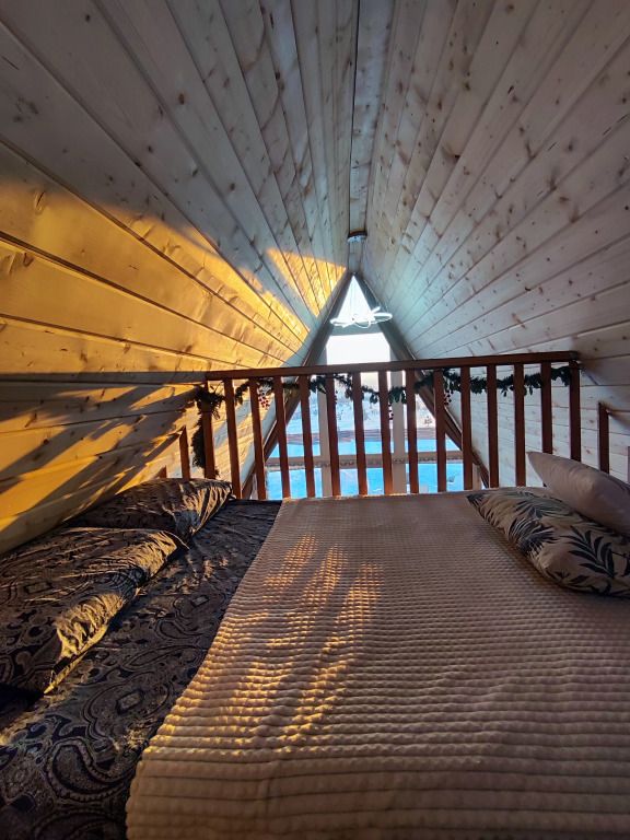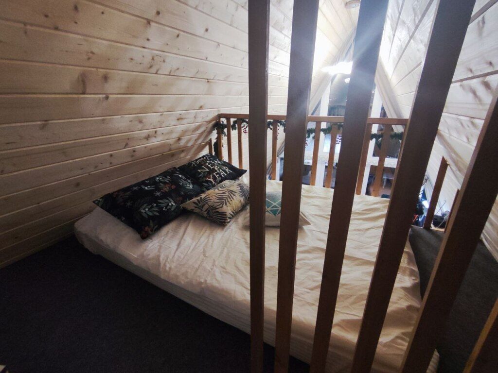 В домике предусмотрено 4 спальных места: двуспальная кровать на антресольном этаже и двуспальный диван на первом этаже.