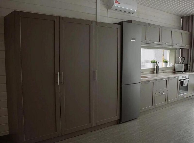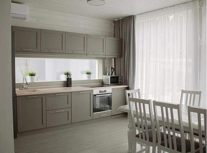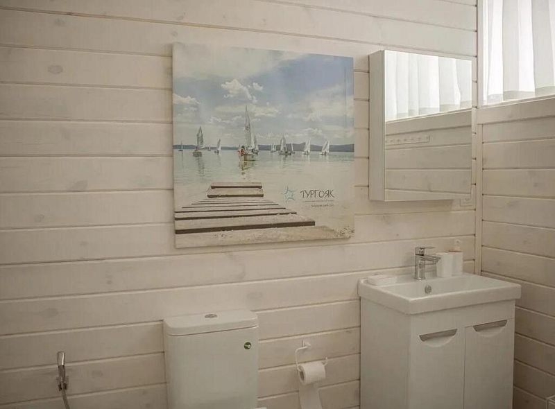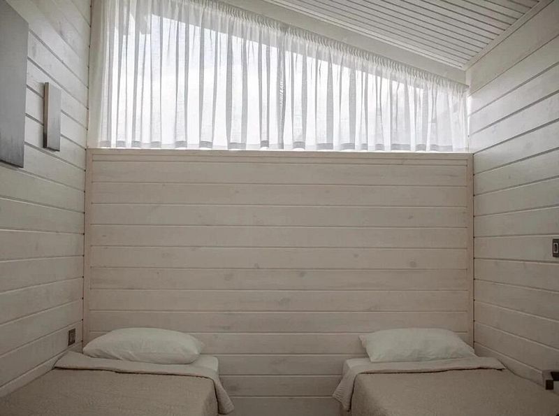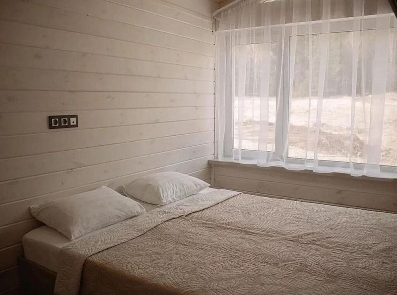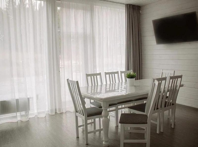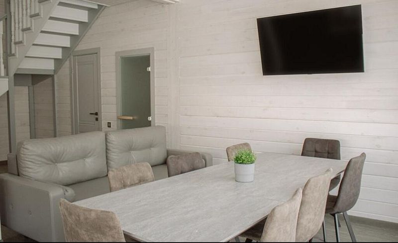 На первом этаже просторная кухня и обеденная зона с раскладным диваном, своя сауна и оборудованная мангальная зона, а на втором этаже – 4 отельные спальни. Вместительность до 10 человек. Всё очень красиво, уютно и комфортно.