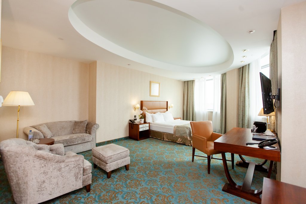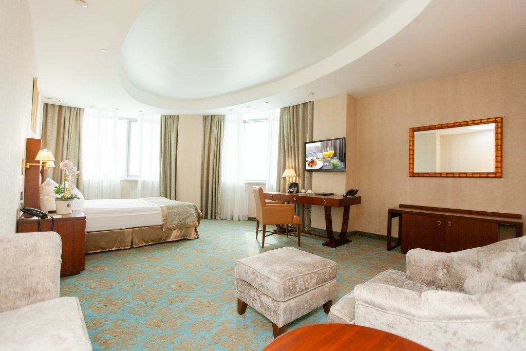 Шикарный двухкомнатный люкс с двуспальной кроватью kingsize. Панорамный вид с 19 этажа - самого высокого этажа отеля.