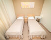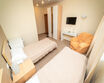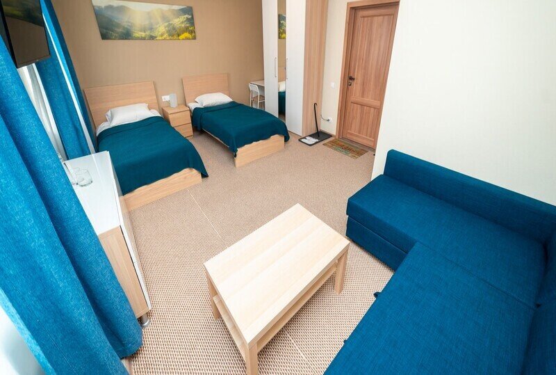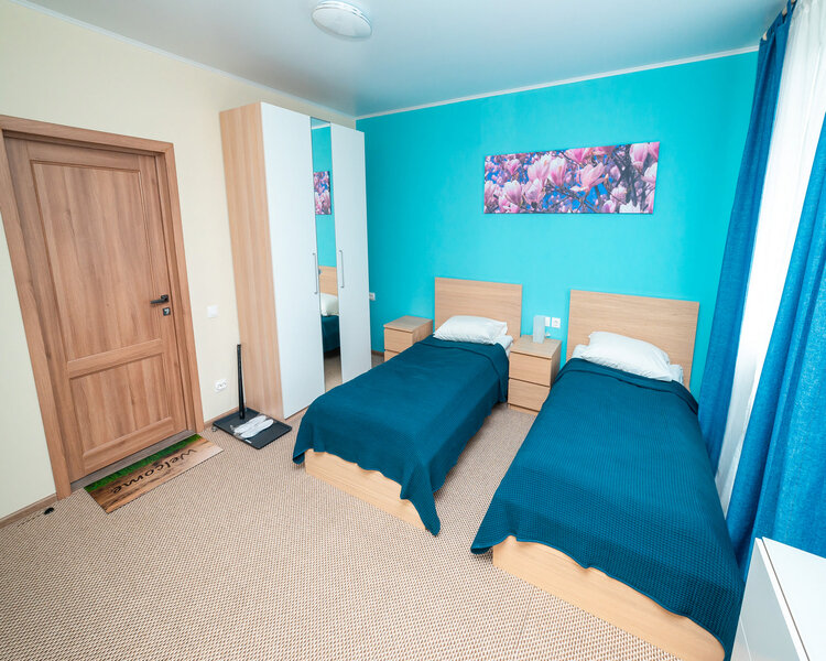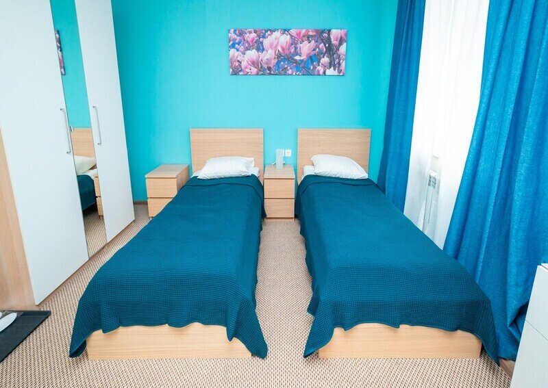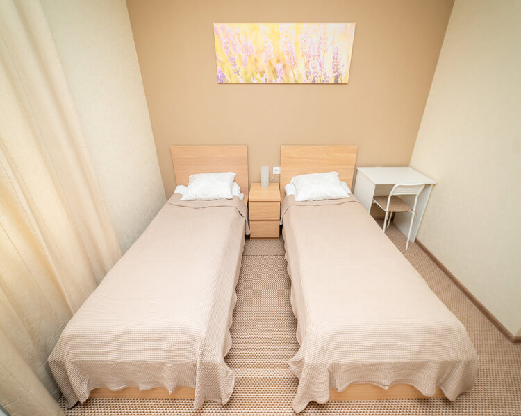 Две 1-спальные кровати, диван или кресло, шкаф, стол, стул, тумбы, ТВ, Х, с/у с душем.