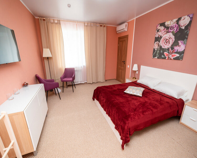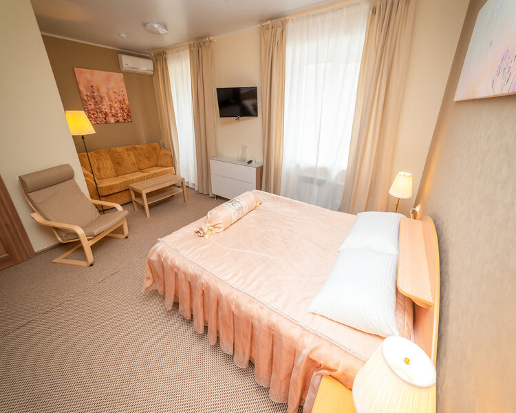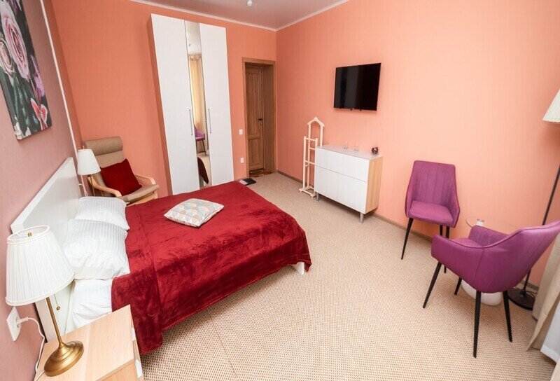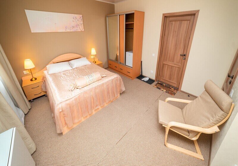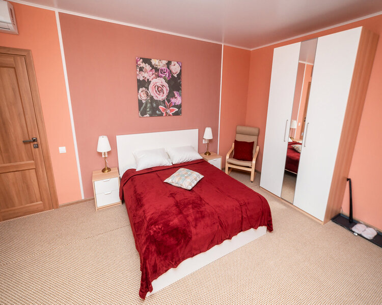 Двуспальная кровать, диван, шкаф, тумба, ТВ, Х, кондиционер, с/у с душем, инфракрасная сауна.