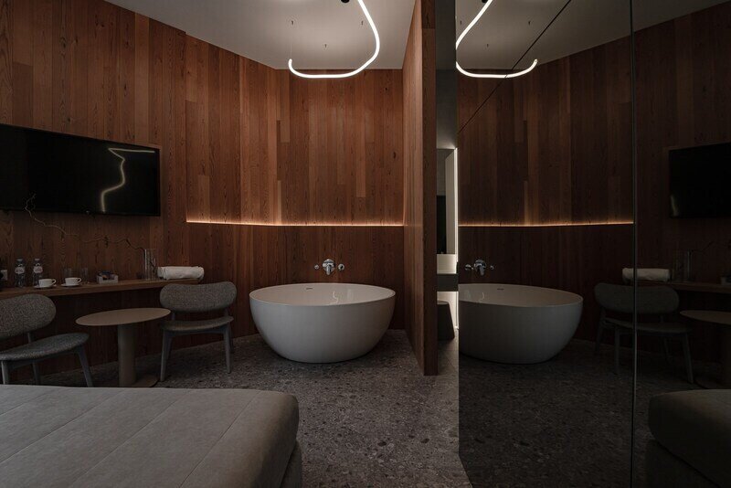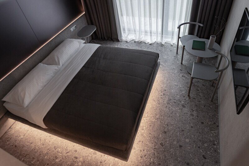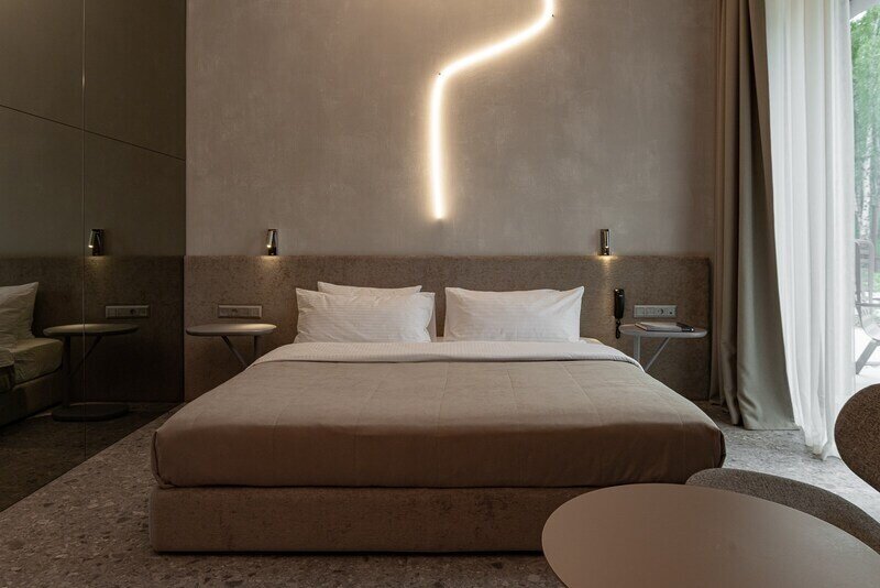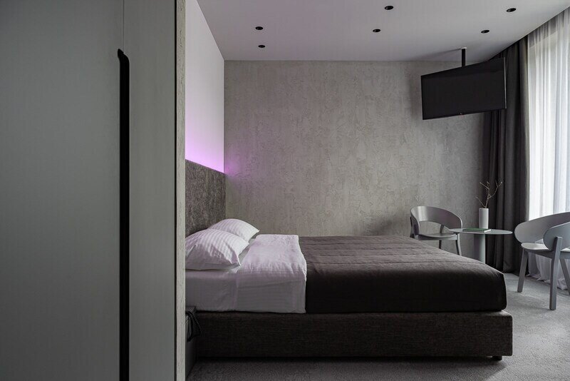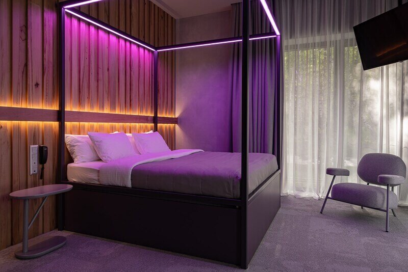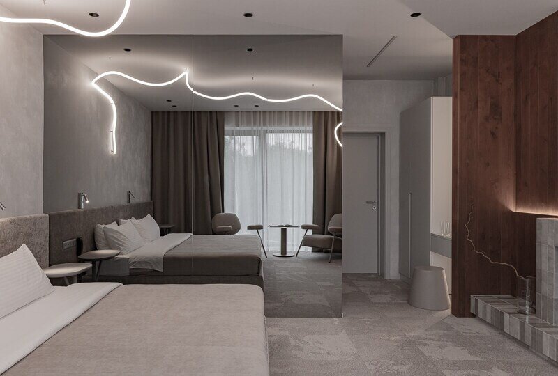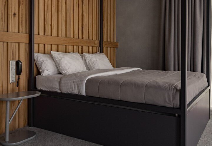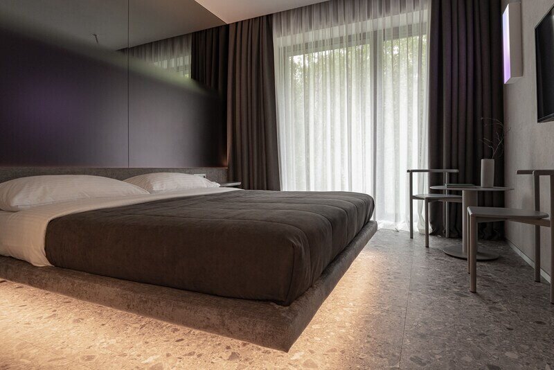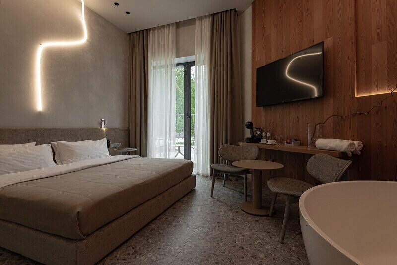 Для размещения предусмотрено 30 комфортабельных номеров с уникальными названиями и оригинальным дизайном. В каждом номере установлена необходимая корпусная и мягкая мебель, дополнительные места обустроены на выкатных кроватях – уникальное решение для гармоничной организации пространства комнаты. Предусмотрен кондиционер, холодильник, сейф, ТВ, телефон, есть чайник и набор посуды. В санузле – душ или ванна, тапочки, халаты, фен.