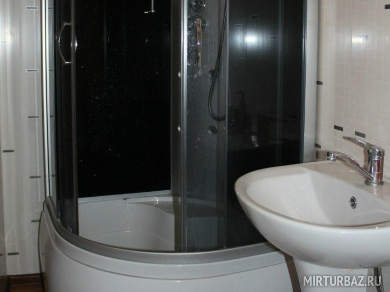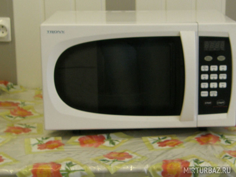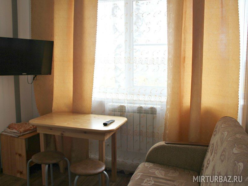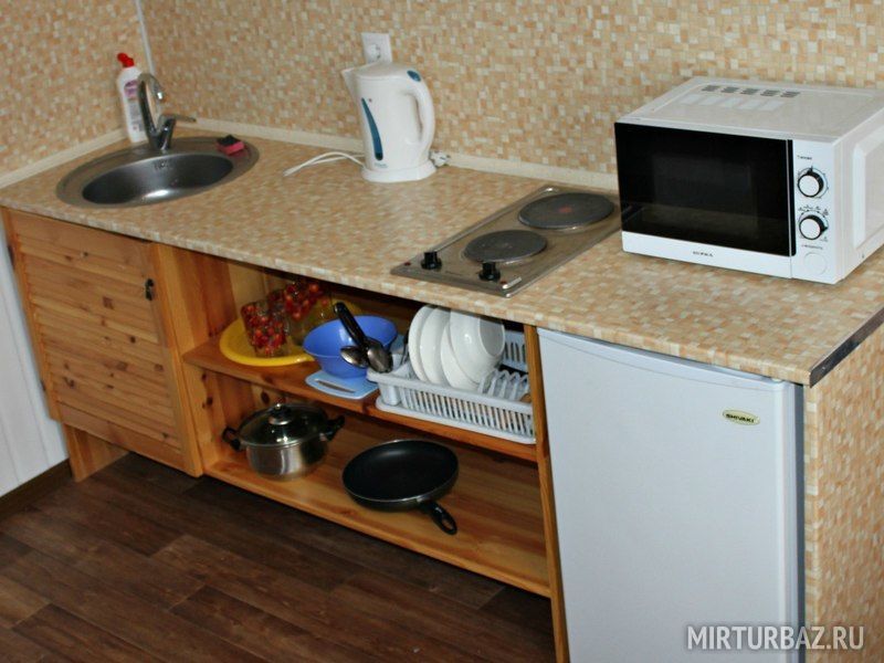 В номере двуспальная кровать, кресло, ТВ, холодильник, набор посуды, чайник, электроплита, микроволновка, стол, кухонная зона, санузел, душ.