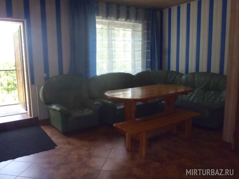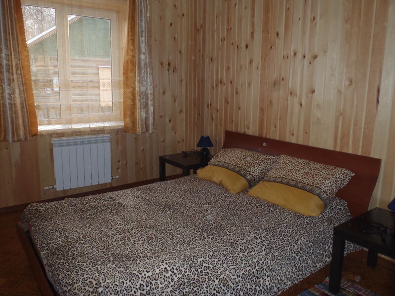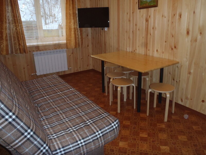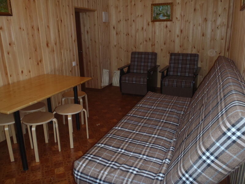 В коттедже 2 спальни, гостиная, одна двуспальная и две 1,5-спальные кровати, диван раскладной, два кресла, ТВ, санузел, кухонная зона, холодильник, набор посуды, чайник, электроплита, стол, микроволновка.