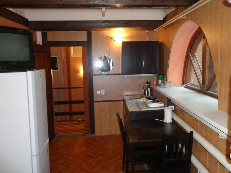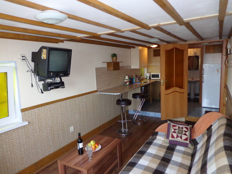 В гостиной: три раскладных двухспальных дивана, телевизор со спутниковым ТВ, кухня с мойкой и всем необходимым для приготовления пищи. Обеденный стол, шесть стульев. Душ и туалет раздельные. На берегу у Большого апартамента своя беседка с мангальной зоной.