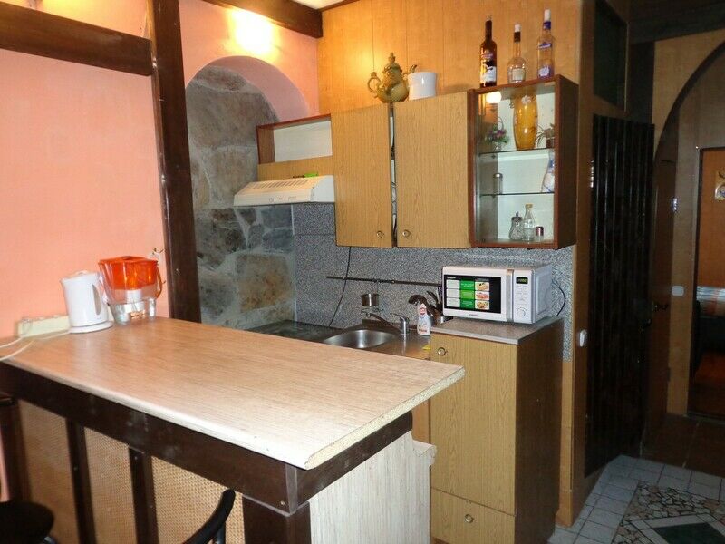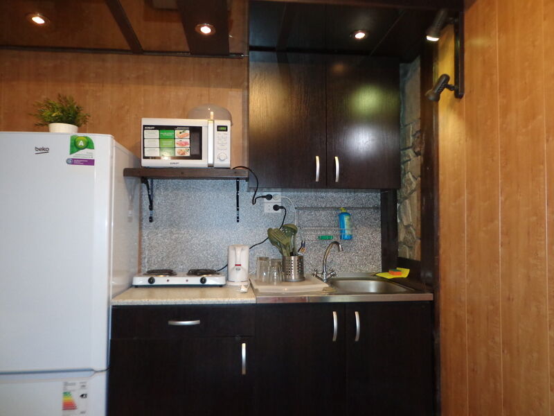 Кухонная зона с мойкой оборудована всем необходимым для приготовления пищи. Душ и туалет совмещены. На берегу у малого апартамента беседка с оборудованной мангальной зоной.