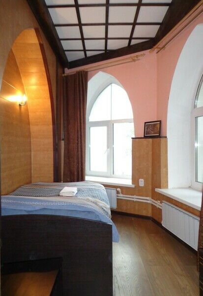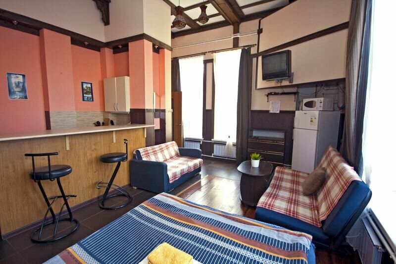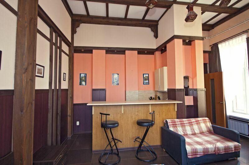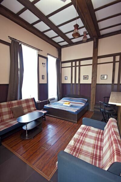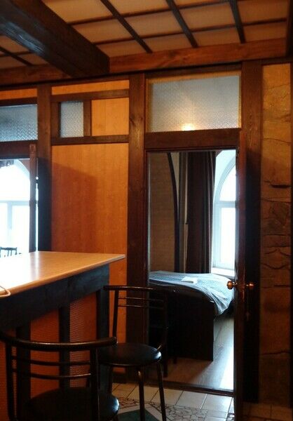 Состоит из трёх изолированных комнат: две спальни и гостиной-спальни. Также отдельная небольшая кухня с мойкой и всем необходимым для приготовления пищи.