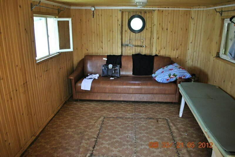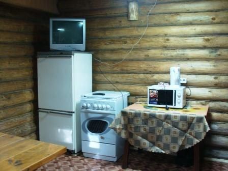 Сруб отапливается электричеством, имеется мангал и котел с треногой.