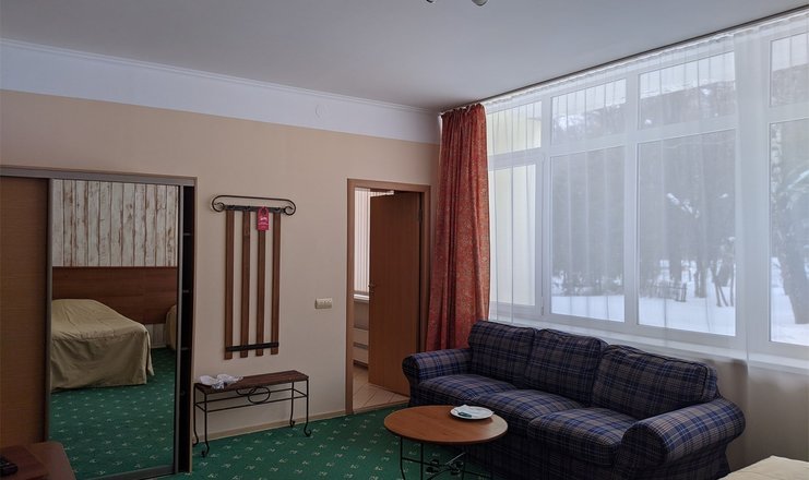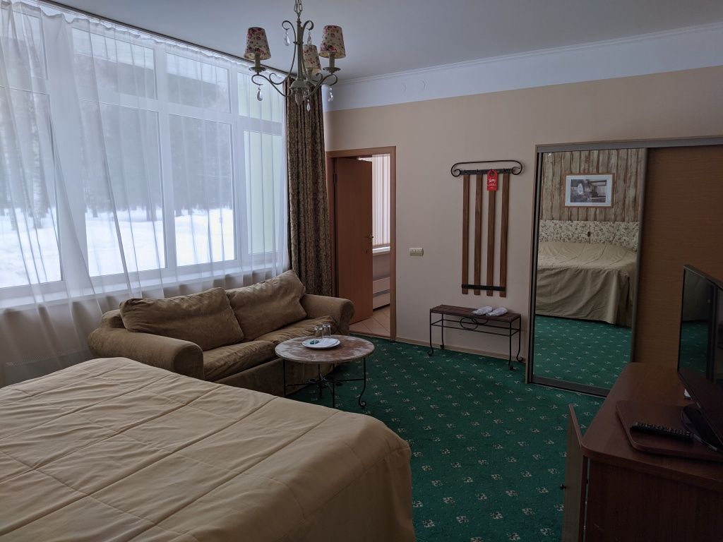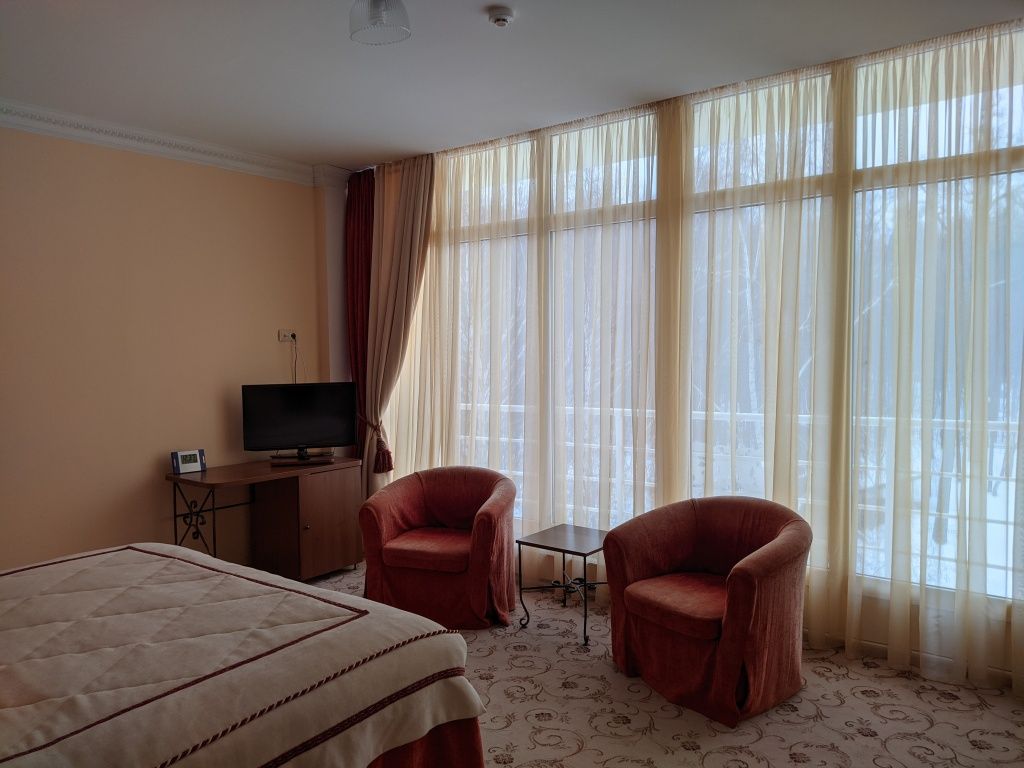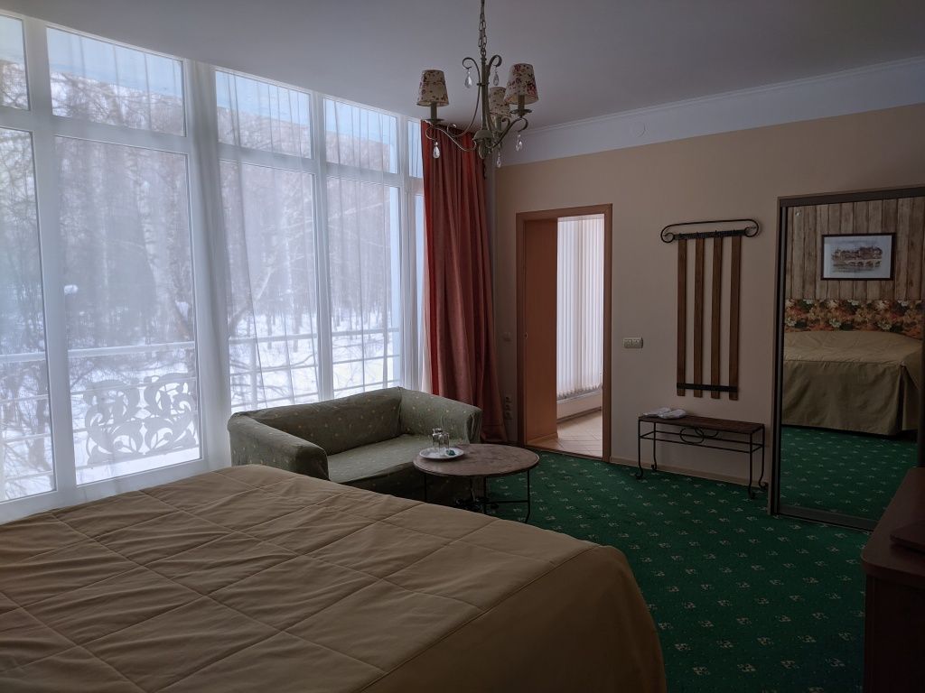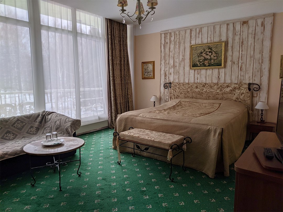 Уютный номер с панорамным остеклением, балконом, видом на парк отеля, с большой высокой кроватью, диваном, большой ванной комнатой (10 кв.м).