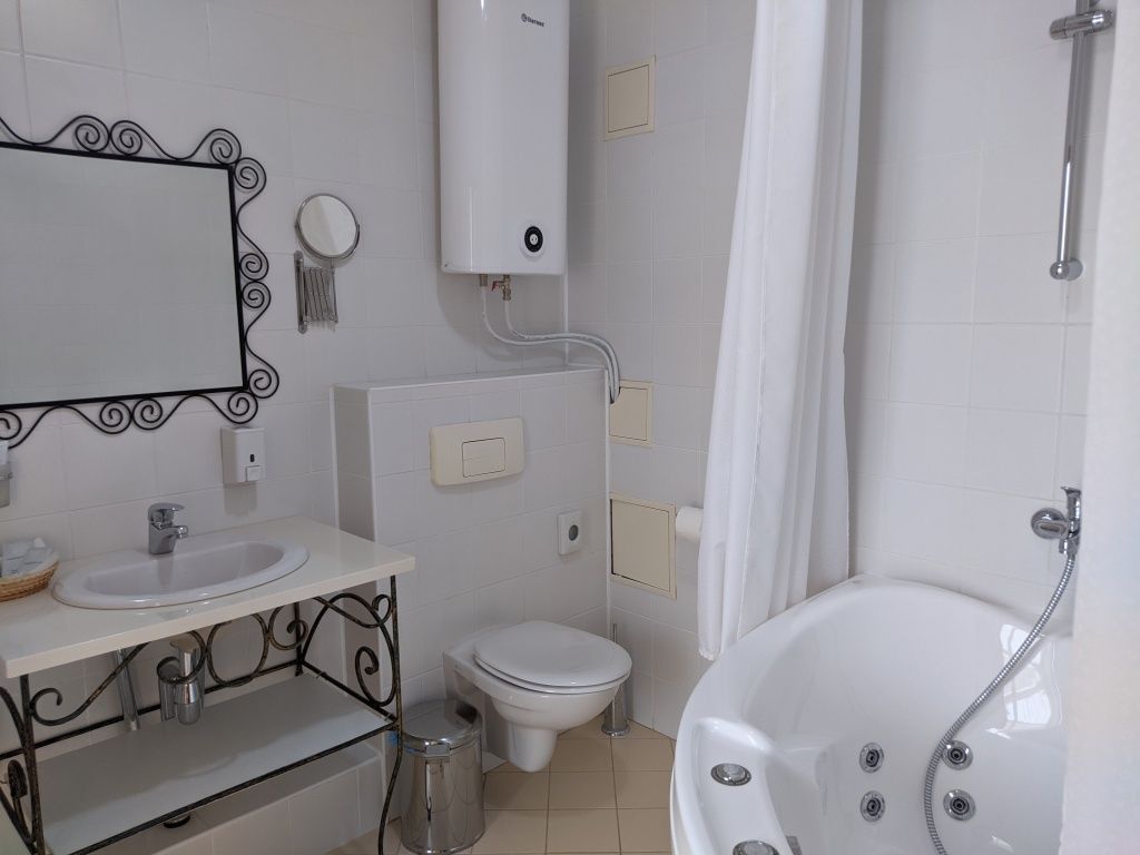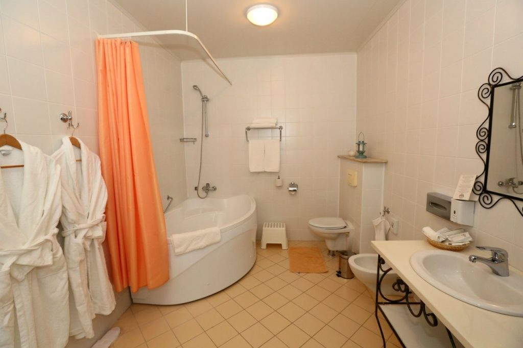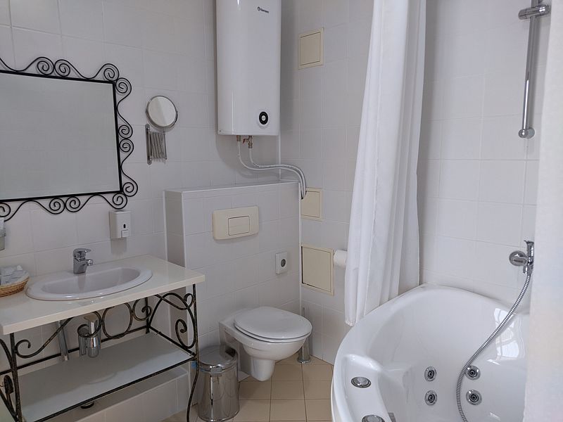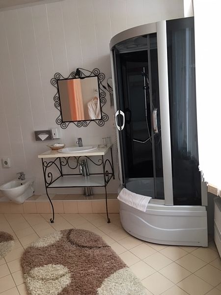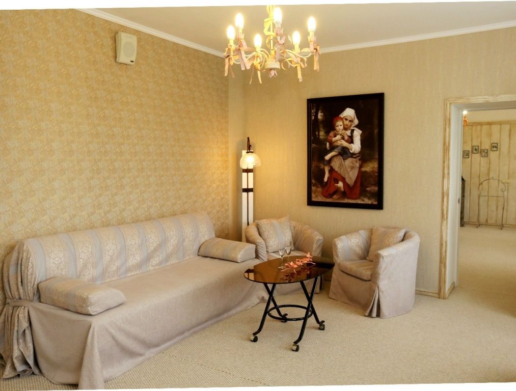 Номер оформлен в стиле шебби-шик, в светлых тонах. Включает гостиную с диваном, креслом, телевизором, кухню с большим холодильником, электроплитой, СВЧ-печью, чайником, набором посуды, спальню с большой кроватью, шкафом, туалетным столиком, телевизором, санузел 10 кв.м. с ванной, душевой кабиной, раковиной, туалетом, биде.